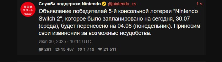 Nintendo уже отреагировала на новости о предупреждении Цунами и перенесла в Японии объявление победителей лотереи на 5-ую поставку Nintendo Switch 2 в Nintendo Store на 4 августа, победителей должны были раскрыть сегодня ещё с утра.