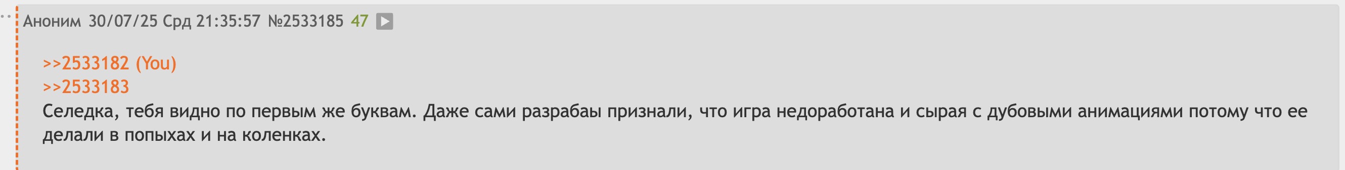 >>2533895 Твой отзыв полон ярости и личных нападок, но я постараюсь ответить по пунктам, насколько это возможно, не опускаясь до твоего уровня.
