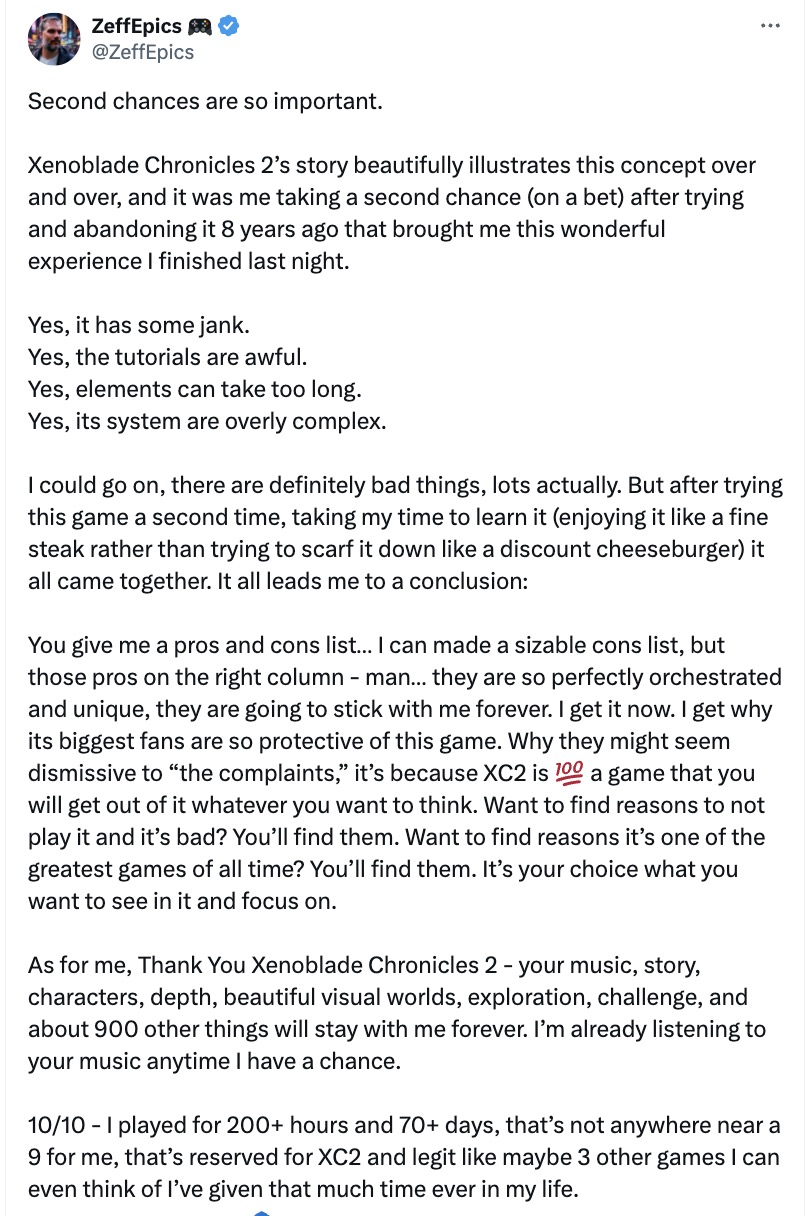Если ты дашь мне список "за и против"... Я могу составить длинный список "против", но вот эти плюсы — в правой колонке — чёрт возьми… они настолько уникальны и точно выстроены, что останутся со мной навсегда. Теперь я понимаю. Я понимаю, почему самые преданные фанаты так яростно защищают эту игру. Почему они могут казаться пренебрежительными к "жалобам" — потому что XC2 на 100% — это игра, в которой каждый найдёт то, что хочет в ней видеть. Хочешь увидеть, почему она плохая и в неё не стоит играть? — найдёшь. Хочешь понять, почему это одна из величайших игр всех времён? — тоже найдёшь. Всё зависит от того, на чём ты сам решишь сфокусироваться.