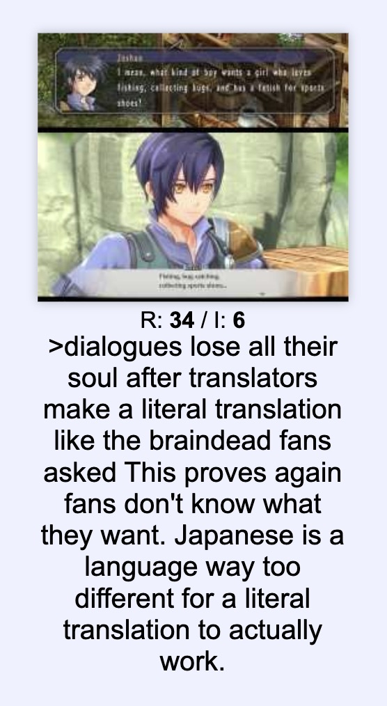 >>2539909 At first I was like: >если так переведена вся серия, то можно сказать, что все кто играл не на японском, играли в фанфик по мотивам. Просят перевести две строчки как положено, что для такого эксперта не составит труда. But then: >Мы спорим о, так сказать, философских вопросах, а такие байты – это провокации чтобы попытаться поймать на чём-нибудь и перевести всё на личности с "да ты и языка-то не знаешь, оказывается, всё твои остальные аргументы следоватльно инвалид, и я победил!"