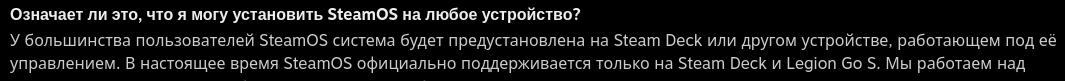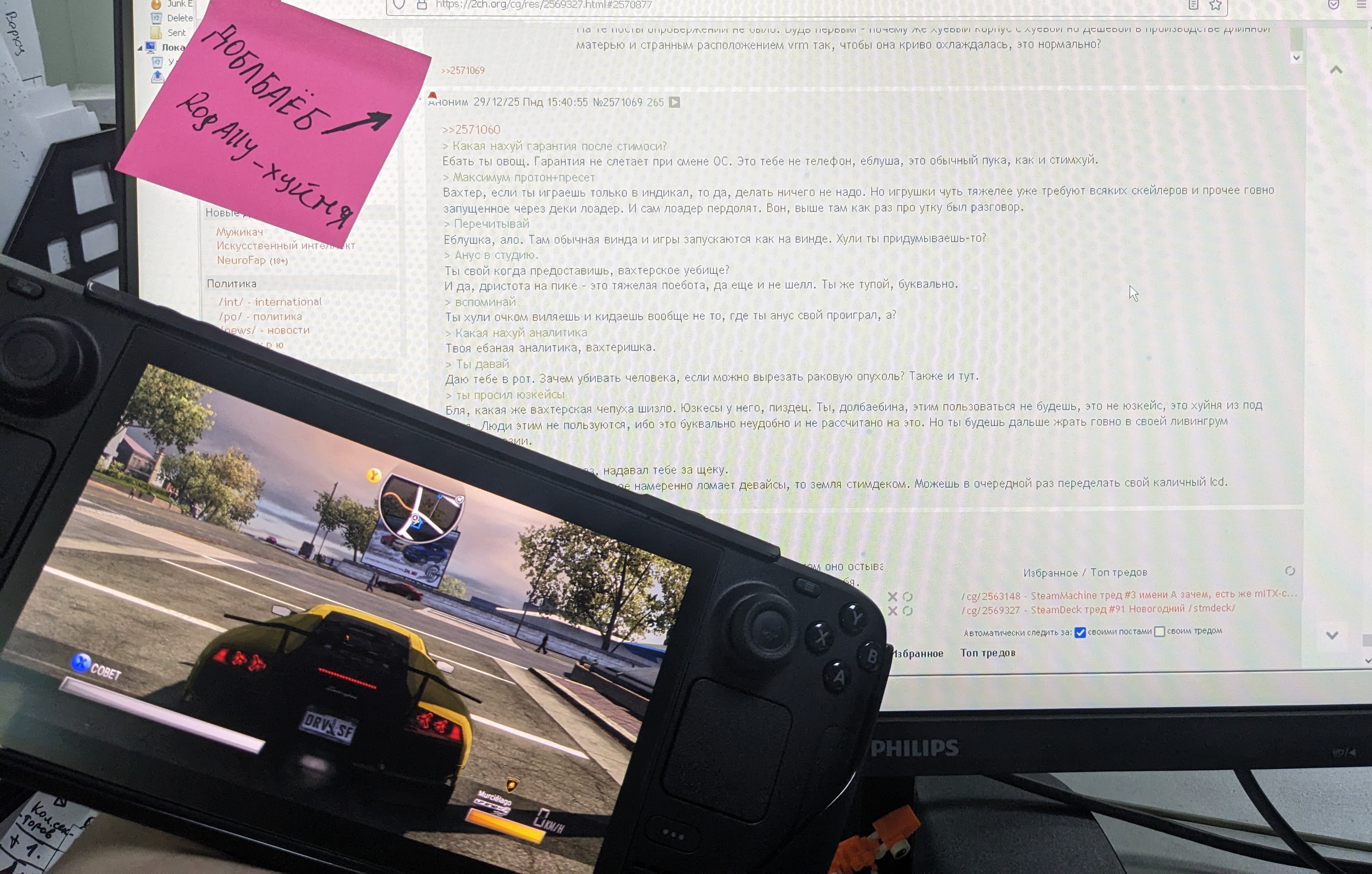 Q: Где и как купить этот ваш этот стимдек? A: Ozon, WB, DNS, Авито или любой другой магазин или продавец с отзывами. Будь внимателен и не торопись, цена на одну и ту же версию в разных местах может отличаться чуть ли не в три раза. Q: Какой объём брать? A: 256Гб хватит если играть по две-три игры за раз, ещё для индюшатины место останется. Берёшь 64Гб — сразу бери SSD на замену (её сделать довольно просто), WD-SN740 или Samsung pm991 к примеру. Либо докупай качественную SD-карточку, например SanDisk Extreme Pro или Samsung Pro Plus. Q: В ААА не поиграть? A: Поиграть. Относительно свежие ААА дают 30 кадров и более в средне-низких. Недавно завезли losless scaling. Q: А стримить с ПК можно? A: И это можно, отлично работает стимлинк, мунлайт, экспириенс по отзывам крайне положительный. Q: Сколько держит батарея? A: Зависит от выставленных настроек фпс, TDP, яркости и самой игры. От 1.5ч в традиционно неоптимизированном кАААле до 6ч и более в безграфонном инди. OLED-версия живёт от батареи на 10-20% дольше. Q: Как устанавливать пиратские игры? A: Перенести установленную (или портабл) папку с игрой с компутера на дек и "добавить" её EXE-файл в Steam. Способов переноса несколько, гугл в помощь. Либо поставить на дек торрент-клиент и скачать игорь сразу туда. Q: Закатил в дек пиратку, а она лежит в библиотеке серым кирпичом, хочу обложечку! A: Ставишь decky — сборник плагинов. В нём SteamGridDB — плагин для удобного навешивания артов и обложек. И ещё много всякого. Q: Эмуляцию завезли? A: Естественно. Есть отдельные эмуляторы во встроенном магазине приложений (где всё бесплатно), есть Emudeck. Все основные эмуляторы в нём уже есть. PS3 эмулируется так себе, от игры к игре, Switch эмулируется неплохо, 40 кадров наберётся. Q: Хочу установить Шиндошс / переустановить SteamOS! A: Дек прекрасно загружается с флэшки, шаманишь Rufus'ом, втыкаешь в консоль через OTG-адаптер и вперёд. Можно сделать дуалбут, но придётся делить SSD на две части. Q: Он тяжёлый? A: Тяжелее большинства портативок, но отличная эргономика и продуманный дизайн делают своё дело, дискомфорта при долгой игре нет. Q: Заведётся ли игра_нэйм на деке и будет ли нормально работать? A: https://www.protondb.com/explore, но с вероятностью 99.9% всё заведётся и работать будет. Q: А вот посмотрите [очередной_стопицотый_"УБИЙЦАстимдека"], он жи лутьши))) А: Отлично, мы за тебя рады, пройди в тред по нему, а если нет - создай. Q: Что насчёт Стимдек-2? Когда будет? Что внутри? Может, подождать его? А: На данный момент кроме слухов ничего нет. По словам вальвы вторая версия выйдет только когда будет прорыв в технологиях. Ждать смысла нет, текущий стимдек отлично держится и будет держаться ещё долго - играет эмуляторы и старьё, а немалая часть свежайших релизов имеет специально заточенный под него пресет настроек графики. Q: Ваша шапка гавно, у меня ещё куча вопросов! A: Как ни странно, гугл. Одно из (можно сказать, решающих) преимуществ дека — огромное и активное коммьюнити в стиме, реддите и куче других сайтов, а ещё триллиард видев на slowтюбе. С вероятностью 101% твою проблему уже обсосали и решили.