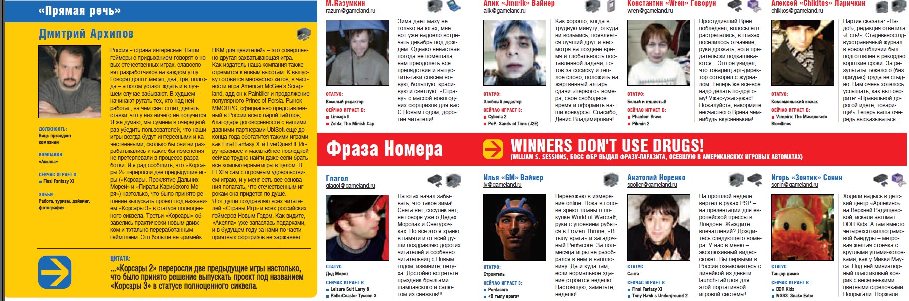 Подарили подписку на него в 2004 году, не особо нравился журнал. Самое интересное - рецензии на игры для консолей, ибо у самого была ps2. Но этого добра была максимум 1/5 журнала. Сначала какие-то охуительные новости, на которые было похуй больше чем полностью. Вторая половина - просто говно, обзоры патчей каких-то с диска для всякой писишной параши, ТАКТИКА для олигофренов, причём зачастую всяких до предела линейных игор, киберспорт, аниме, кино, железо, короче всё что нужно в журнале о видеоиграх. На дисках - зачастую параша та ещё, хотя иногда проскакивали интересные переведённые ролики. Короче для меня интереснее было тусоваться в "компьютерном" клубе возле зоны ps2 и в магазинчике видеоигр на рынке, обсуждая игры с компанией таких же геймеров.