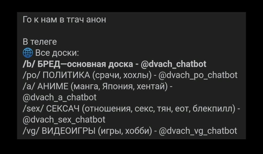 Анонимный чат-бот в телеграмме, несколько досок. Быстрое, надежное место для обмена картинками и файлами, для общения и координации. Без цензуры и без банов.