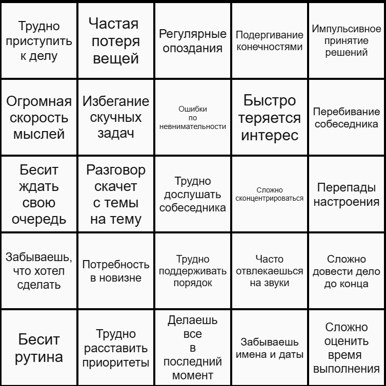 Прокрастинация, хронические опоздания, невозможность заставить себя работать, пока петух в жопу не клюнет, неорганизованность, раздражительность, отвлекаемость. Если эти проблемы преследуют вас по жизни и серьезно мешают вам достигать успеха в сферах работы, школы, социальных кругов и личной жизни, то вам стоит задуматься - возможно, вы являетесь одним из 5-7% населения земного шарика, что победили генетической лотерее и родились с некоторыми нарушениями развития мозга, которые и известны под названием СДВГ! Но это не повод отчаиваться, ведь кто предупрежден, тот вооружен, и узнав, что это такое, как оно влияет на поведение и откуда растут ноги многих ваших неудач, вы наконец-то сможете начать выправлять свою жизнь. А чтобы выправлялось лучше, пиши мне и добавляйся в конфу: https://t.me/inloner