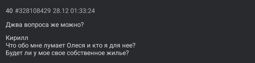 >>295179 Спасибо тебе, анон! Олеся - это моя сестра, и мы с ней реально родственные души, очень люблю ее. Последнее время невероятно мало общаемся, спрашивал у нее, она говорит что все хорошо, никаких обид нет, просто устала от работы и бытовухи (у нее мужик - омежный домосед, который никуда ее не пускает, уже и не помню когда у нас приключения были в последний раз), но я боялся что она скрывает и обижена/злится на что-то. Даже легче стало. И насчет квартиры ты меня дико обнадежил, буду усиленно пахать и откладывать. В общем спасибо тебе, анонче!