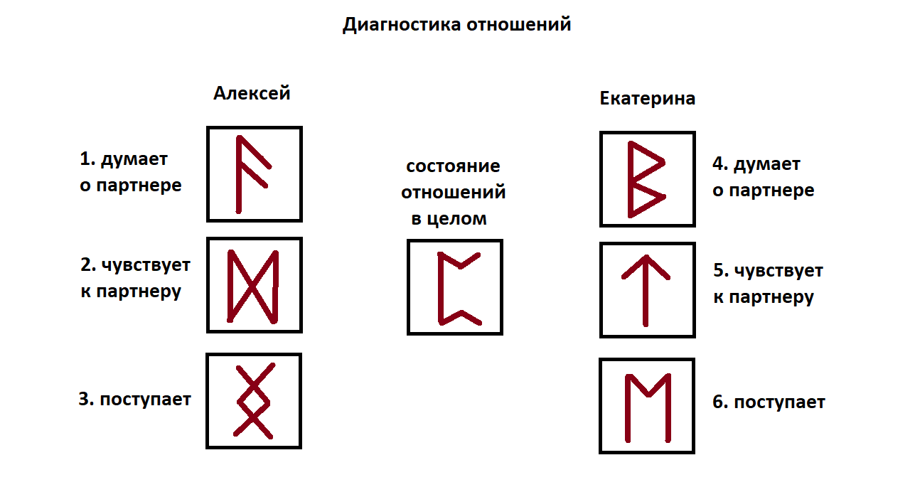 1. Ансуз. Екатерина привлекает интерес Алексея, тот много думает о ней и хочет общаться. 2. Дагаз. А. надеется на начало нового этапа вместе. 3. Ингуз. А. проявляет инициативу, стремится соединиться и создать пару, заняться сексом.