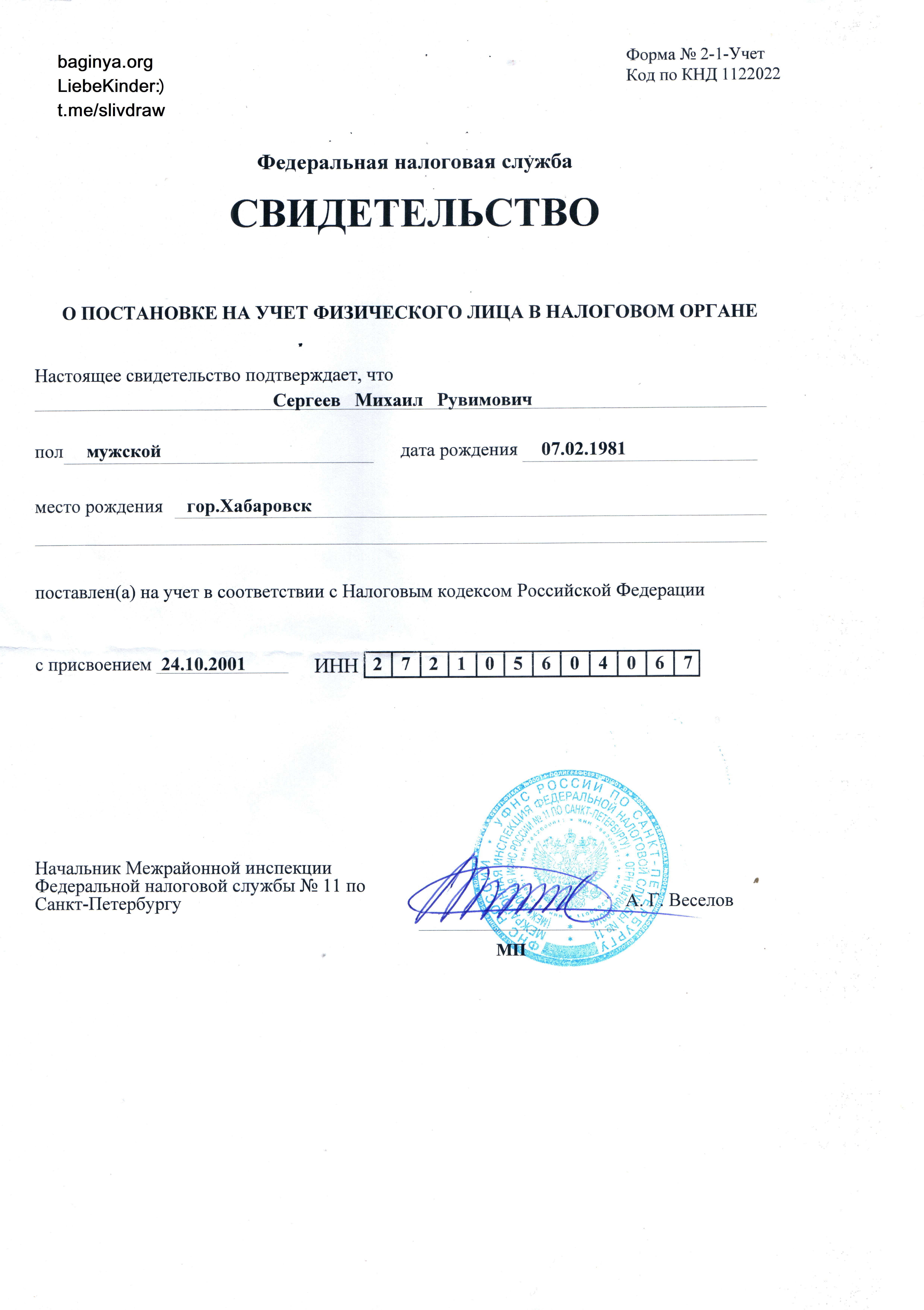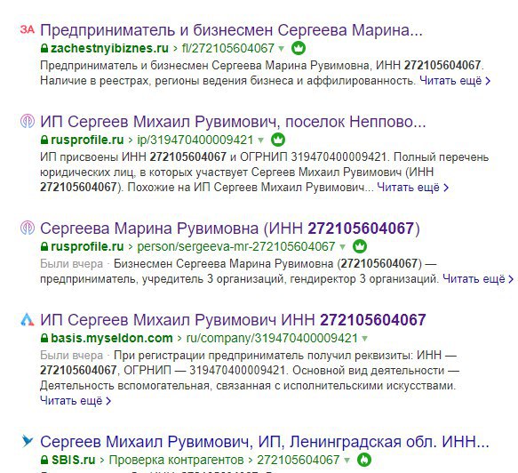 >>4482 Как хорошо, что инн указан не только на "подтирушки", но ещё и отлично пробивается в поисковике. И что же мы видим в результатах такого поиска? Произошла чудовищная ошибка в госархивах! Один и тот же номер делят два таких разных человека - Сергеева Марина Рувимовна и Сергеев Михаил Рувимович. Жестокая игра судьбы!