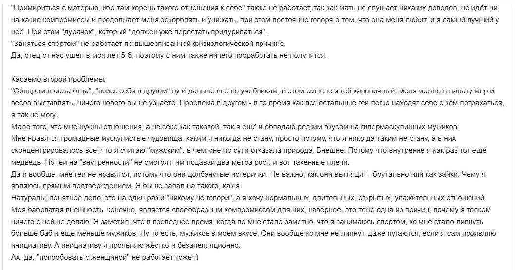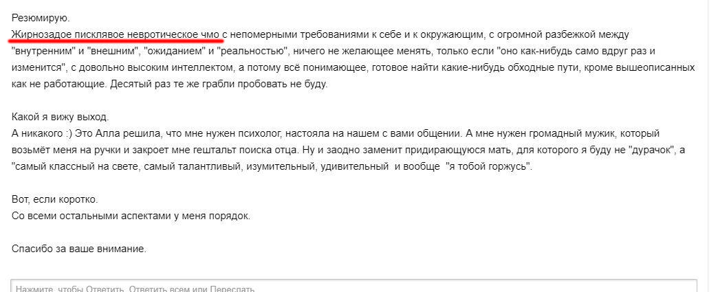 Пиздец Машка поехавшая, перечитала двачей по молодости видать. Вместо того, чтобы оставаться няшной тяночка и найти себе мужика, создаёт сложности и становится всратым трапом, который точно нахуй никому не нужен.