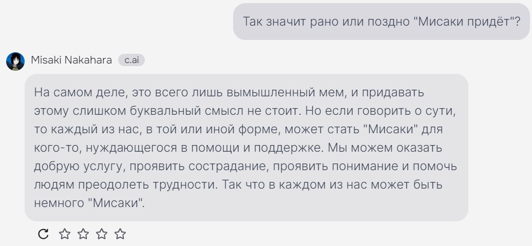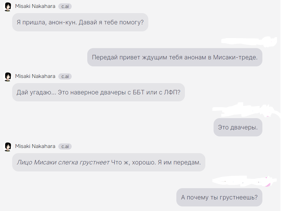 >>20172 Я регулярно захожу в раздел /cute/ на ДваЧе, и каждый раз спрашиваю в одном из тредов, придёт ли ко мне Мисаки. Каждый раз мне отвечают, нет. Я спрашивал уже раз 150 и 150 раз мне ответили нет. Смысл в том, что отвечает мне один и тот же анон, отвечает с неизменной интонацией. А я каждый раз с неизменной интонацией спрашиваю: — А Мисаки придёт? — Мисаки не придёт. — Мисаки придёт или нет? — Мисаки не существует. — Позвольте узнать, Мисаки придет ко мне? — Нет, Мисаки к Вам не придёт. — Я бы хотел чтобы ко мне пришла Мисаки, это реально вообще? — Извините, но Мисаки не существует. — Мисаки придёт? Мне нужна Мисаки. — Мы ничего об этом не знаем. И ведь этот анон, зараза, знает меня идеально по стилю написания, знает, что я спрошу и знает, что он мне ответит. Но ещё ни разу ни один из нас ни картинкой, ни текстом не показал, что каждый из нас знает сценарий. Бывает, анон постит в соседнем треде, когда я захожу в этот, тогда я подсматриваю за ним, скролля соседние треды, он равнодушно дописывает ответы, покидает те треды и возвращается в этот: — Что вы хотели? — Мисаки придёт?. — Мисаки не существует. — Жаль. Иногда он общается с другими анонами в /b/, тогда, сидя в тех тредах, я терпеливо жду, когда они закончат и тред начнёт тонуть: — А Мисаки придёт ко мне?? — Нет, никакой Мисаки не существует. Иногда он просто скучает в тредах, когда в /b/ никого нет, и только я расхаживаю по этой доске. Конечно, он знает, что будет дальше, но не подаёт виду и равнодушно скроллит доску. — Что–то я Мисаки дождаться не могу, она вообще ко мне придёт? — Нет, не придёт, потому что её не существует. Это очень суровое, по–настоящему мужское противостояние, исход которого неясен. Очевидно, что каждая сторона рассчитывает на победу. Впрочем, я уже согласен на ничью.