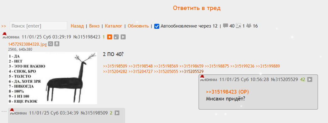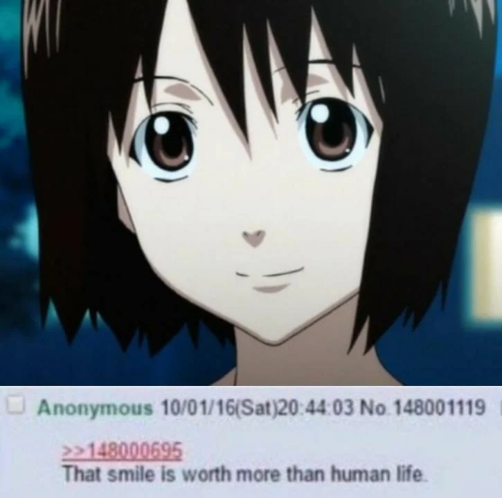 Я регулярно захожу в раздел /cute/ на ДваЧе, и каждый раз спрашиваю в одном из тредов, придёт ли ко мне Мисаки. Каждый раз мне отвечают, нет. Я спрашивал уже раз 150 и 150 раз мне ответили нет. Смысл в том, что отвечает мне один и тот же анон, отвечает с неизменной интонацией. А я каждый раз с неизменной интонацией спрашиваю: — А Мисаки придёт? — Мисаки не придёт. — Мисаки придёт или нет? — Мисаки не существует. — Позвольте узнать, Мисаки придет ко мне? — Нет, Мисаки к Вам не придёт. — Я бы хотел чтобы ко мне пришла Мисаки, это реально вообще? — Извините, но Мисаки не существует. — Мисаки придёт? Мне нужна Мисаки. — Мы ничего об этом не знаем. И ведь этот анон, зараза, знает меня идеально по стилю написания, знает, что я спрошу и знает, что он мне ответит. Но ещё ни разу ни один из нас ни картинкой, ни текстом не показал, что каждый из нас знает сценарий. Бывает, анон постит в соседнем треде, когда я захожу в этот, тогда я подсматриваю за ним, скролля соседние треды, он равнодушно дописывает ответы, покидает те треды и возвращается в этот: — Что вы хотели? — Мисаки придёт?. — Мисаки не существует. — Жаль. Иногда он общается с другими анонами в /b/, тогда, сидя в тех тредах, я терпеливо жду, когда они закончат и тред начнёт тонуть: — А Мисаки придёт ко мне?? — Нет, никакой Мисаки не существует. Иногда он просто скучает в тредах, когда в /b/ никого нет, и только я расхаживаю по этой доске. Конечно, он знает, что будет дальше, но не подаёт виду и равнодушно скроллит доску. — Что–то я Мисаки дождаться не могу, она вообще ко мне придёт? — Нет, не придёт, потому что её не существует. Это очень суровое, по–настоящему мужское противостояние, исход которого неясен. Очевидно, что каждая сторона рассчитывает на победу. Впрочем, я уже согласен на ничью.