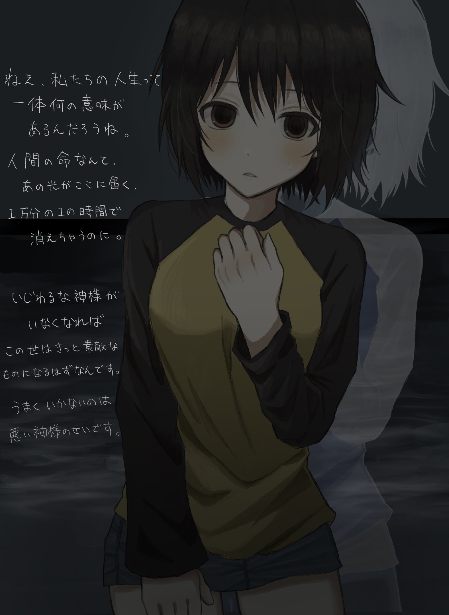 «Говорят, что сейчас в Японии живет около двух миллионов хикикомори. Два миллиона — это огромное число. Если бы кто-нибудь кинул камень на улице, он бы попал в хикикомори… Конечно же, на самом деле этого бы не произошло. Хикикомори ведь не выходят на улицу.»