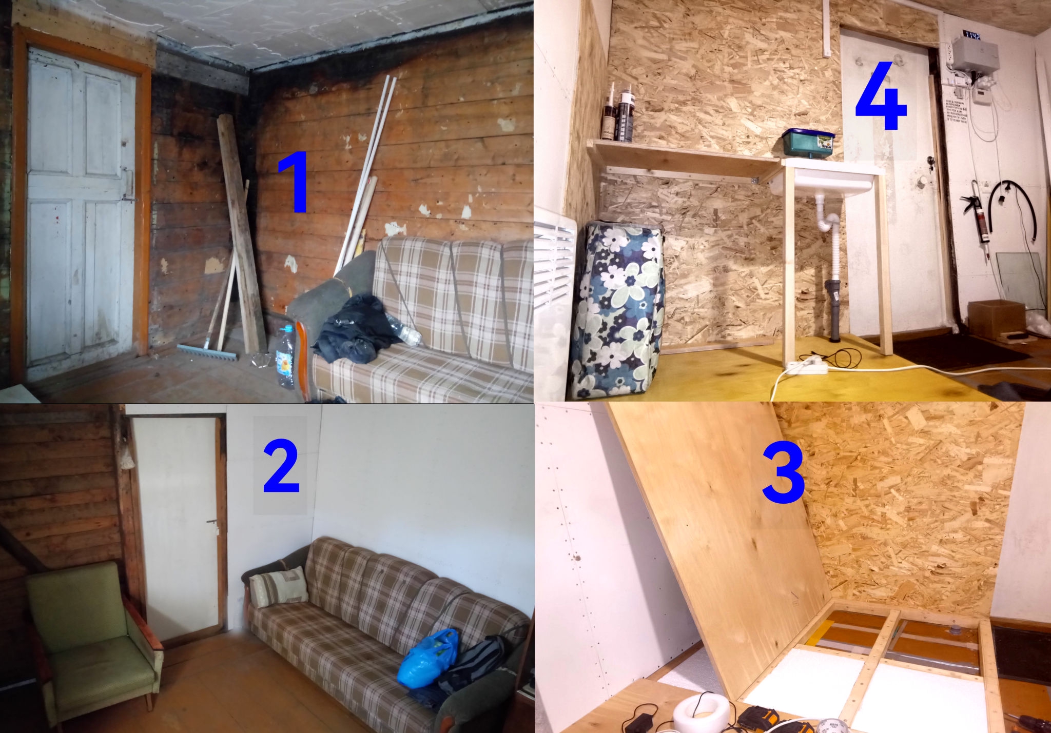 Пенопластом 100мм. Вот на фото видно. Моя первая зимовка в феврале 2024-го выглядела так. Полы, стены и потолки ещё не были обшиты. Заклеил щели в полах армоскотчем, постелил ковёр, и так зимовал две зимы. Зимой было около 10-20 градусов мороза в самые холода, не Урал. Первую неделю обогревался тепловентилятором на 2 кВт. Думал взять на постоянку потолочный ик обогреватель, но остановился на конвекторе. И не прогадал. Ресанта ОК-2000 работает второй год, в режиме нон-стоп, всю осень, зиму и весну. В этом году в мае выбросил старый диван, который уже сыпался и мешал утеплению пола. Поэтому до сих пор сплю на полу, на лежанке из звукоизоляции 50 мм. Пол почти доделал, осталось достелить около 3х кв. метров. Стена, что на фото, за диваном, до сих пор не обшита OSB, а просто заколочена листами двп. В этом году сделал систему приточно-вытяжной вентиляции. Над дверью приточный канальный вентилятор, встроенный в стену. Вытяжной, на 12 вольт, стоит в душевой кабине. Если включать только вытяжку, то работает тихо и сильно не дует, что очень удобно. Приточный работает мощно и громко, хочу заказать на него умное реле с пультом на 4 уровня скорости. В приложении можно настроить периодическую вентиляцию или по событию. Освещение в комнате и в тамбуре тоже работает через умное реле. Утром включается свет в комнате, вечером, перед сном, сам отключается. В тамбуре свет включается на 10 минут и автоматом выключается - так настроил, а то иногда забываю выключить.