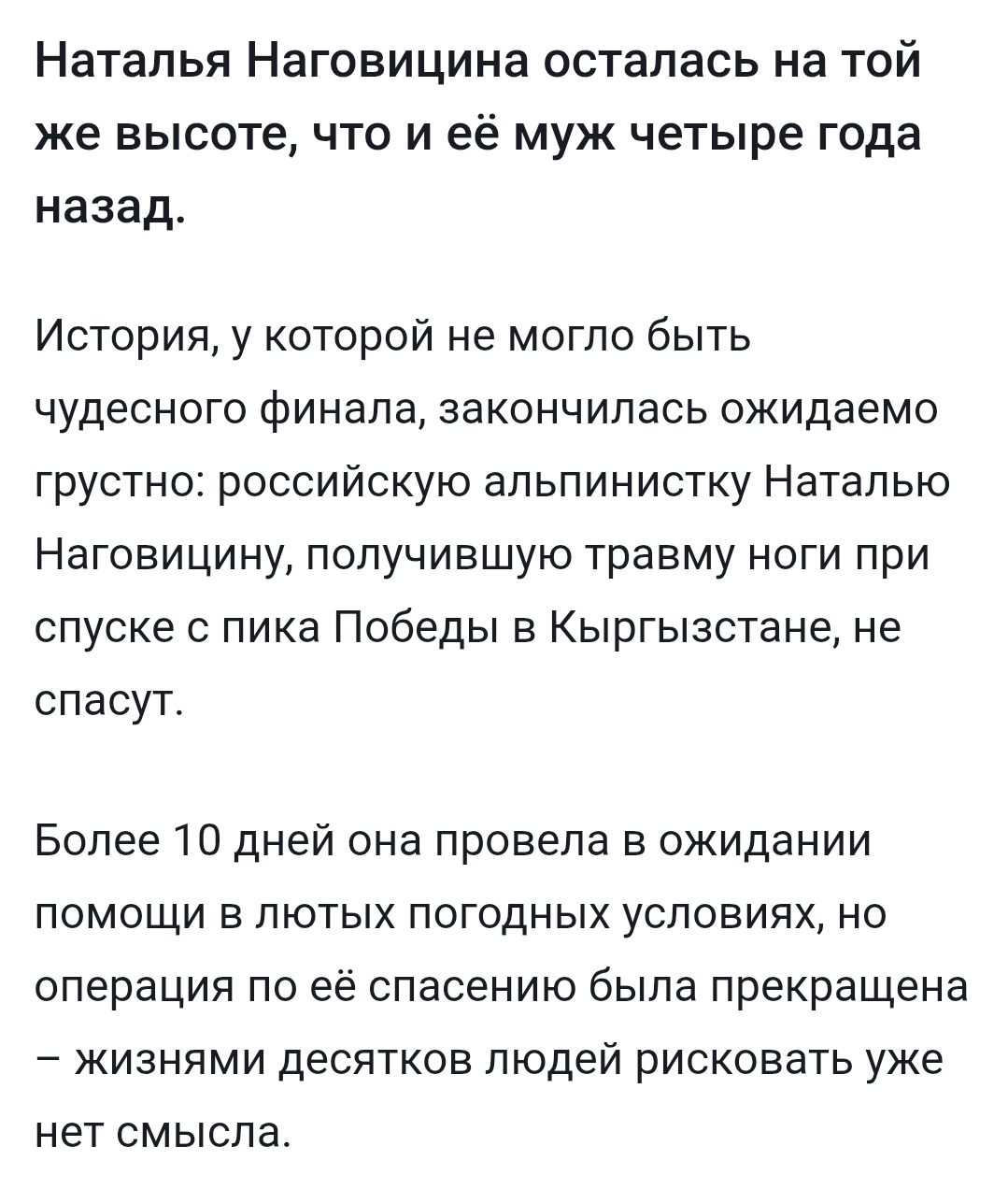 Вы бы лучше иранцев обсудили, которые пару лет назад на восхождении сначала спиздили запасы газа русских, потом попали в беду на высоте из-за раздолбайства, их вытаскивали те же люди, чьи вещи иранцы проебали, потом иранцы начали катить претензии, что их как-то не так спасали и вообще бедные иранцы понесли финансовые потери (отдали в благодарность за спасение свою палатку, а потом передумали и вообще не надо было их спасать). Из-за этого в этом году на них всем настолько похуй было, что когда они сорвались и погибли на китайской стороне пика Победы, все только облегчённо вздохнули. https://www.mountain.ru/article/article_display1.php?article_id=9917