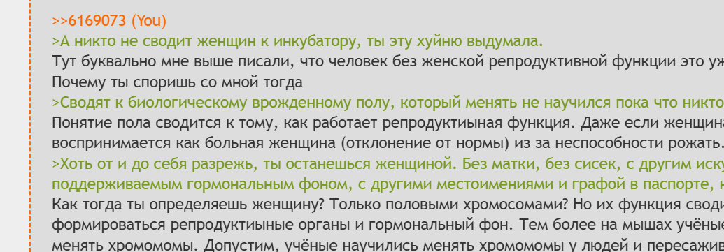 Ты не можешь дать определение женщине, чтобы это не было сведено к "роли инкубатора", пизде и хромосомам (т.е терф определение, с которым ты согласилась по итогу), которое бы было универсально для всех биологических женщин, ВО ВСЕХ СТРАНАХ и по которому ты сама бы была женщиной (примеры разных вариантов определений и виляния >>6169286 - женщина это неуточненный гормональный фон + гендер, >>6169024 - женщина это то что государство считает женщиной, >>6169419 - женщина это биологический пол). Определение женщины у тебя меняется в зависимости от риторики собеседника, ни о какой универсальной защите женщин, феминизме и тд с твоей стороны речи быть и не может. Точно так же ты используешь юридические термины, такие как гарантии в отношении трансгуманизма (>>6169419) со стороны "логики" и "законов физики", приписываешь женщинам несуществующие долги, называешь отказ от деторождения болезнью "по мнению природы" (>>6169578), хотя отказ от деторождения не является нарушением жизнедетельности организма и не приводит к снижению адаптационных возможностей организма и его способности поддерживать гомеостаз. Твоя риторика про "ущербность" базируется на переживании боли женщинами в процессе их жизни, связанной с их репродуктивной системой, на угнетении связанном с родами и на физических отличиях от мужчин. Любой организм испытывает боль в процессе жизни, и без технического прогресса и мужчины, и женщины страдали бы от множества заболеваний и помирали бы чаще, что делает человеческий организм, по такой логике, "ущербным" в целом, в тч по сравнению с более крупными и сильными видами, которым человек не мог бы противостоять "голыми руками". Если говоря про ущербность ты подразумеваешь моральные и материальные убытки со стороны женщин от мужчин, то как я и говорила с самого начала (>>6154915 →>>6155579 → и прочее) женщина терпит УЩЕРБ только при взаимодействии с хуйней и отношениях с ним, репродуктивное насилие, сексуальное насилие, убийства по признаку пола, рабство, сексуальное насилие над малолетними систематически происходят только в контексте гетеро отношений. Риски гетеро отношений непропорционально велики с выгодой, являлись инструментом угнетений все существование женщин, женский пол прошел определяющую его селекцию со стороны мужчин (непокладистые и независимые женщины и их потомство выживали реже), которой частично и определена твоя физиология. Женщины не терпят значительного специфического УНИВЕРСАЛЬНОГО ущерба вне гетеро отношений, который не был бы сопоставим с обычным дискомфортом от жизни любого другого организма. Если бы у самки человека была бы возможность зачать потомство от другой, или возможность партеногенза, то да, сохранился бы дискомфорт от родов до развития технологий, но это незначительный ущерб в следствии репродуктивного бремени, несравнимый с уроном от патриархата и фемцида со стороны мужчин, и мужской пол бы не нужен. Бремя вынашивание существовало бы в любом случае, будь "женщины" гермафродитами или кем угодно другим, но не было бы патриархальных вертикалей власти и эксплуатации одного пола другим, а значит связанного с этим УЩЕРБА. Вне гетеро отношений, вне взаимодействии с хуйней, женщины НЕ ТЕРПЯТ УЩЕРБ от своей физиологии, который не выходил бы за рамки обычного дискомфорта от жизни любого биологического организма. Мы с тобой об этом го