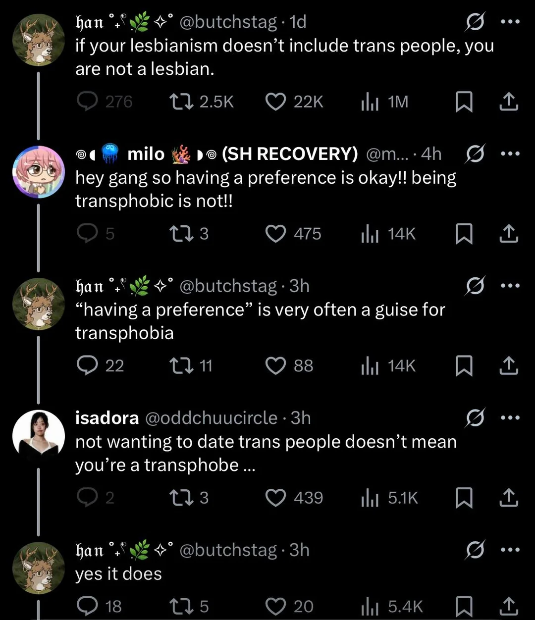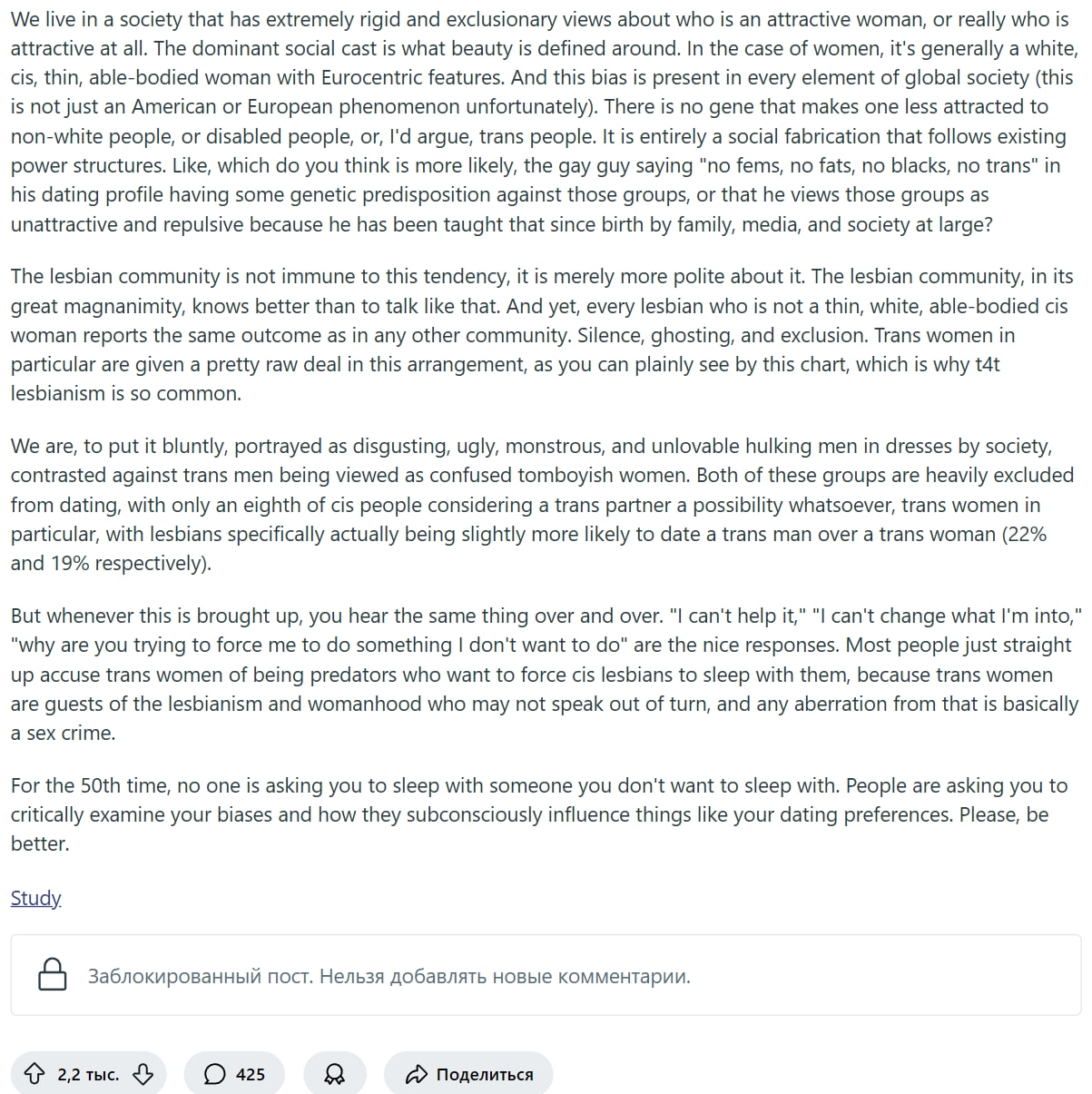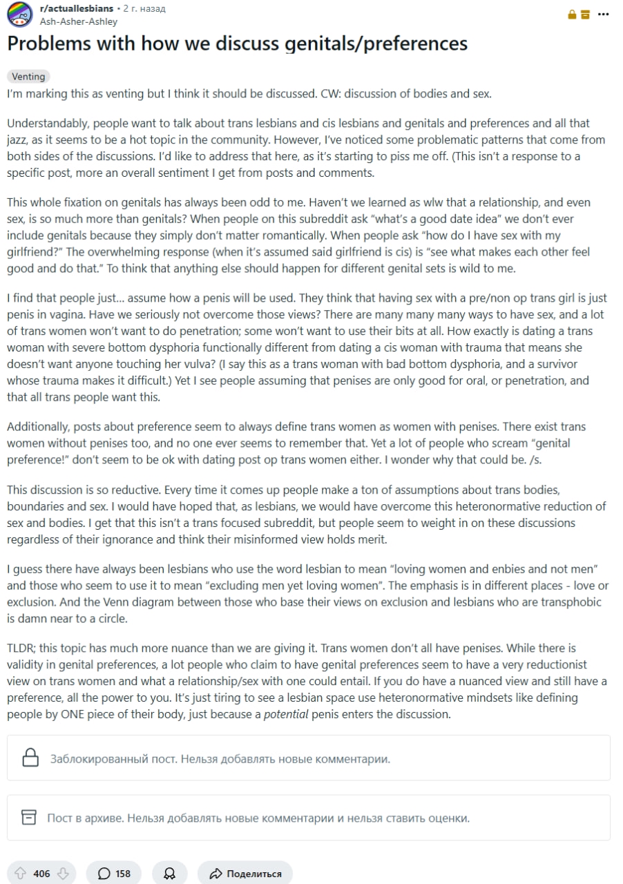 Чеканье предпочтений в крупнейшем соо на реддите для "лесб". Для тебя как гетры это неинтересно, но для феминисток которые не хотят взаимодействовать с мужчинами - да