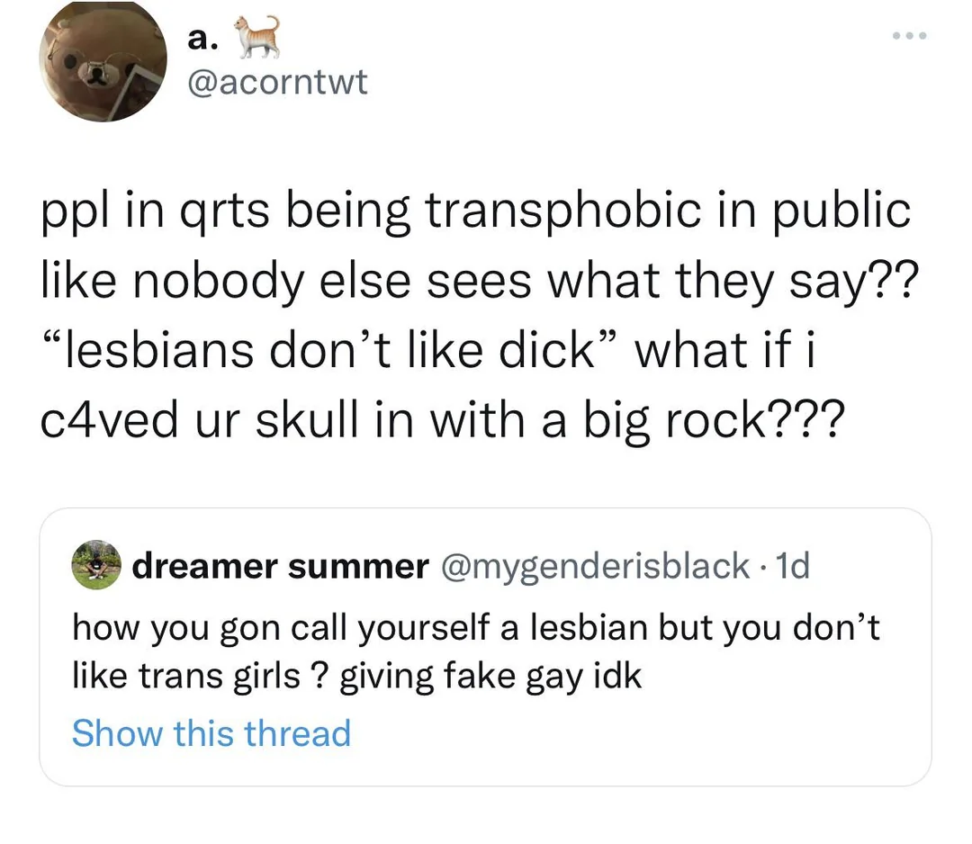 Попытки осветить проблему токсичности и хищничества TQ+ в сообществе цис геев из за цензуры в сообществах для тян и рандомный транс, который открыто ненавидит нас и не репрезентирует женщин