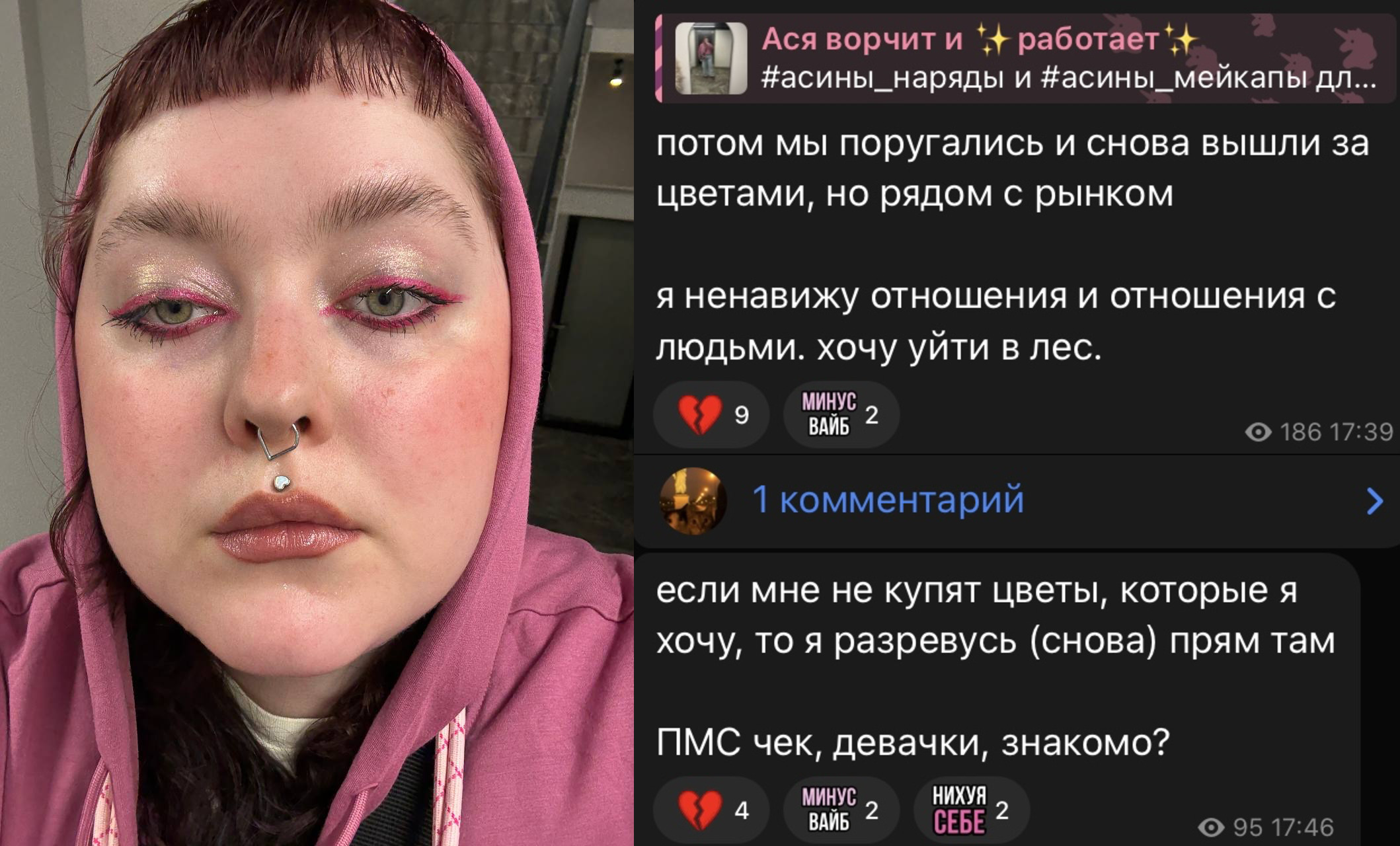 Она бы и рада носить анимеунитазный шмот. Только на ней он сидит ещё ублюдочнее чем на тонко-звонких школьницах, потому и бесится. А бомбёж на бимбожопы происходит потому, что ей даже с бимбожопой по-прежнему ничего не светит, вот и агрится. Она как типичная делулу думает, что дело во всяких шмотках и жопах, когда на самом деле её сторонятся из-за вайбов городской сумасшедшей.