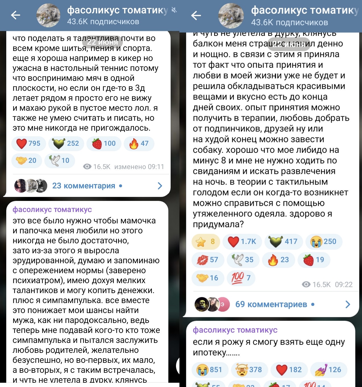 >>6176832 """"">Если ты красивая — у тебя всё равно найдут недостаток, например, ноздри разного размера, жёлтый зуб, расширенные поры, кривые ноги, маленькая грудь, жидкие волосы. А если у тебя есть очевидный недостаток во внешности, то это просто раздолье для хейтеров. Если ты не замужем — никому не нужна, если замужем — наверняка за каким-нибудь уродом, потому что кто ещё на такую позарится. Никто не радуется твоим успехам, а если провал, то это обсудят и обмусолят вдоль и поперёк. Если что-то случилось, то ты "доигралась" и "сама виновата"."""""