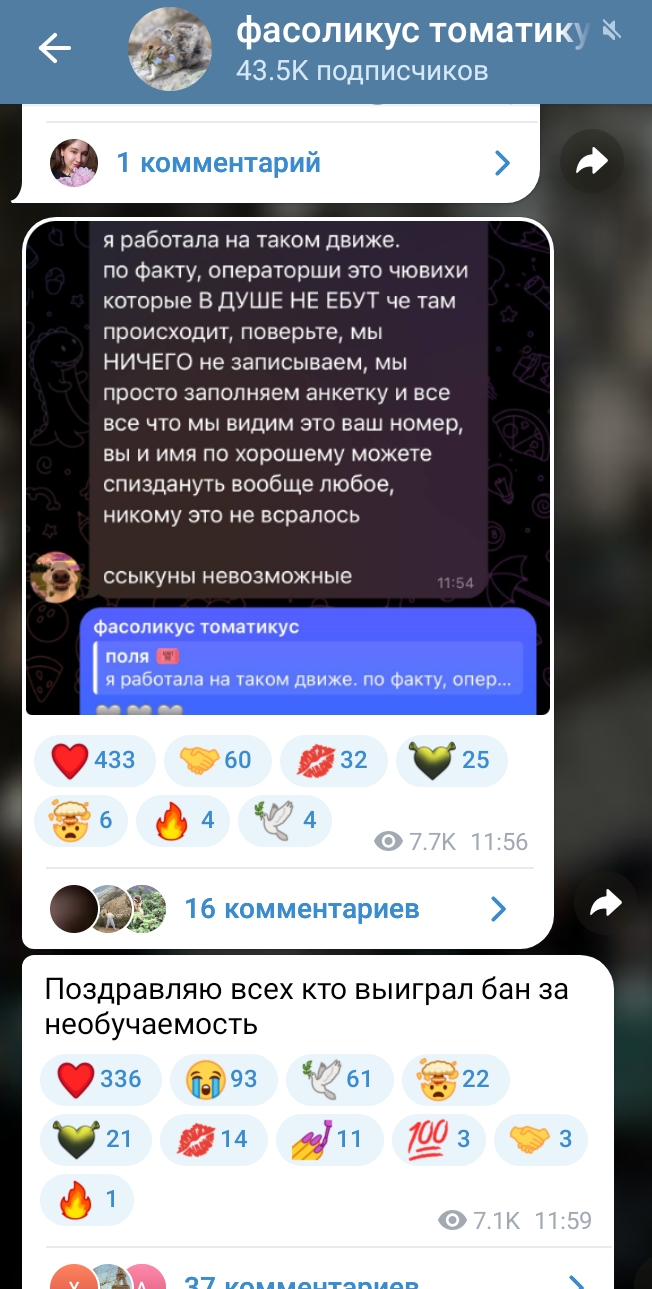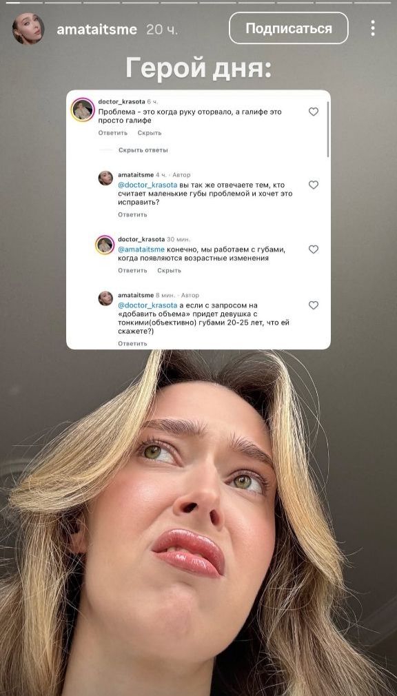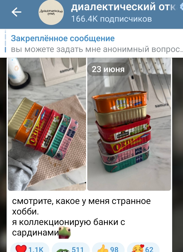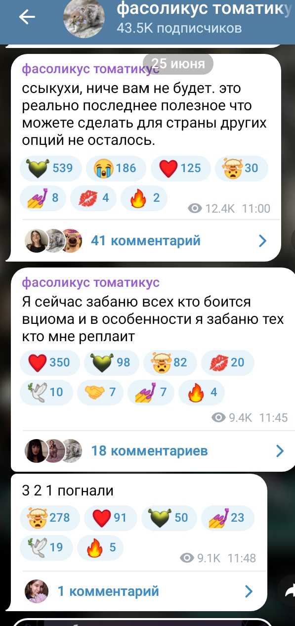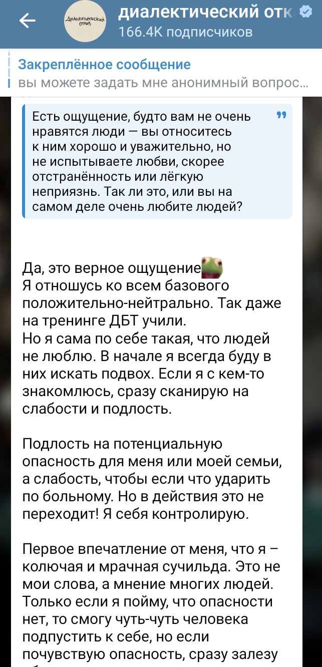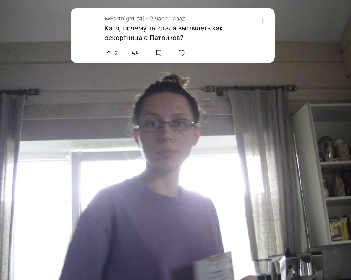 Дней когда Консерва жидко не обсиралась: 0. В этот раз наша самая умная решила про рекламировать опросы ВЦИОМ. Мол, отвечайте, высказывание свою политическую позицию. Участвуйте в опросиках, не бойтесь))) На что ей начали писать, мол, не доверяют таким опросам, не хотят отвечать незнакомым людям, да и в любом случае нарисуют то, что выгодно. На что эта старая злая псина бомбанула и забанила всех "ссыкунов" Тем времён наша смелая нессыкунша: подтерла все посты насчёт сво, удалила видос про асексуальность из-за страха что схватят за пропаганду, послушно нацепила на себя порядковый номер блогера и сидит гавкает на всех не согласных