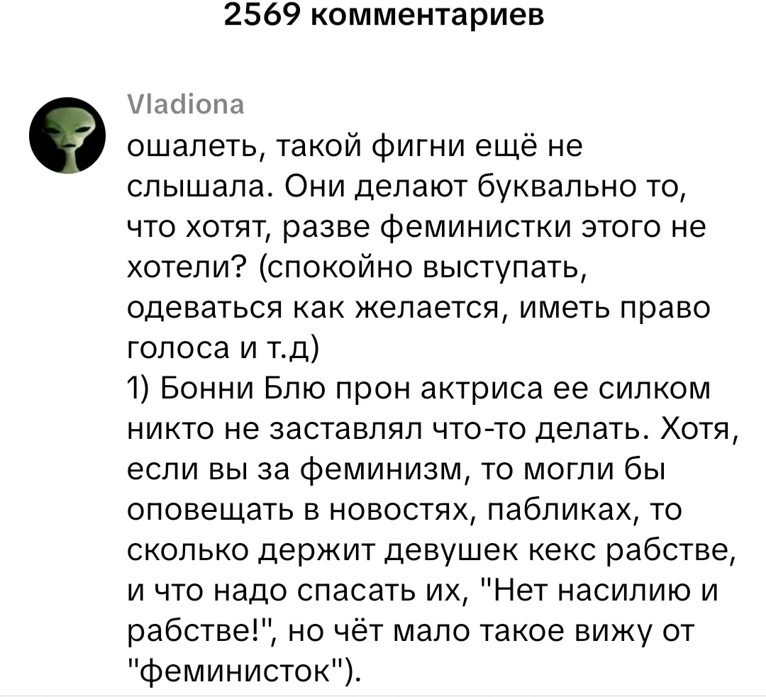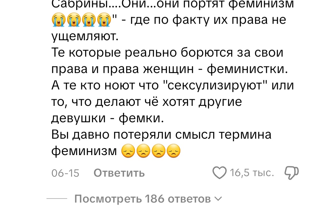 Чтоб вы понимали уровень дискуссии у зумерш. Это комментарий под тикток видео, где девушка говорит о том, какие сейчас произошли культурные поп явления за короткий промежуток времени (мыло Сидни Суини, ситуация с Бони Блю, обложка Сабрины Карпентер). Хуй знает как малолетним кринжухам доносить, что поп культурные явления не самостоятельные. Они санкционированны сверху. И это означает глобальный разворот в право и традвайф. Никакие её маня исследования женского здоровья не произойдут, потому что на женщин всем похуй. Сначала происходит формирование повестки, потом появляются люди с определённым мышлением, и только потом идут исследования, потому что появляется запрос. В запрос может быть только там, где женщина субъектна. На этой блять хуйне 16к лайков. Сука