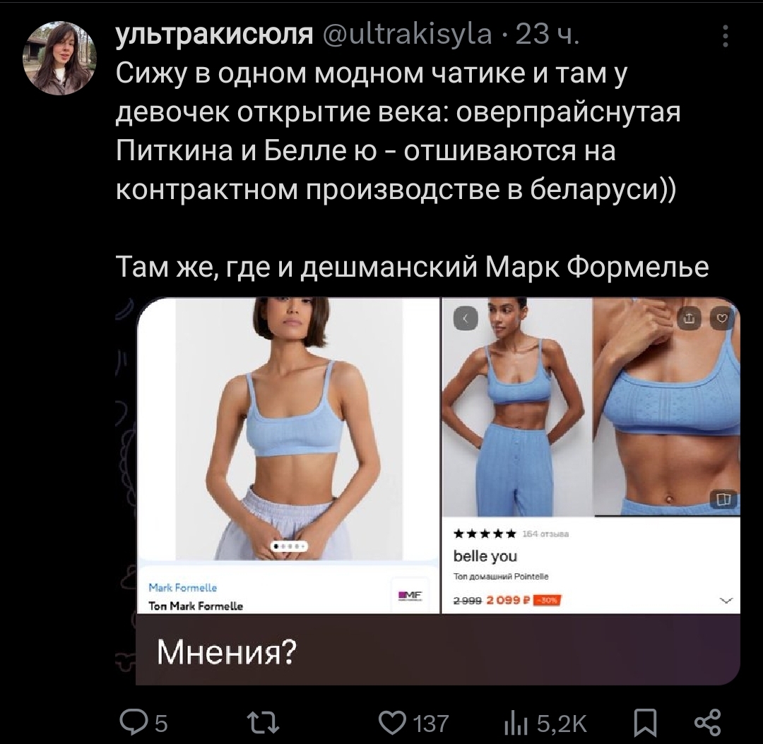 Слушайте, а давайте будете честными, неважно, с рук в европейских барахолках покупаете что-то или заказываете ширпотреб на "озрне", это всё неважно, важно то, что такие кунцы, как у тех, кого вы зачем-то осуждаете, с вами водиться не будут даже как с подружками для онлайн-беседы, так что так агритесь, вашим мужчинам другие будут интересны, ваши подруги, например, или сестры, которые мини носят, а вы нет и в оверсайзе.