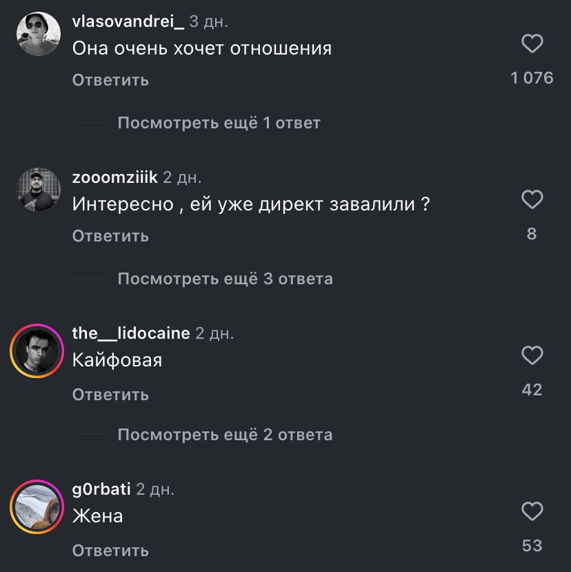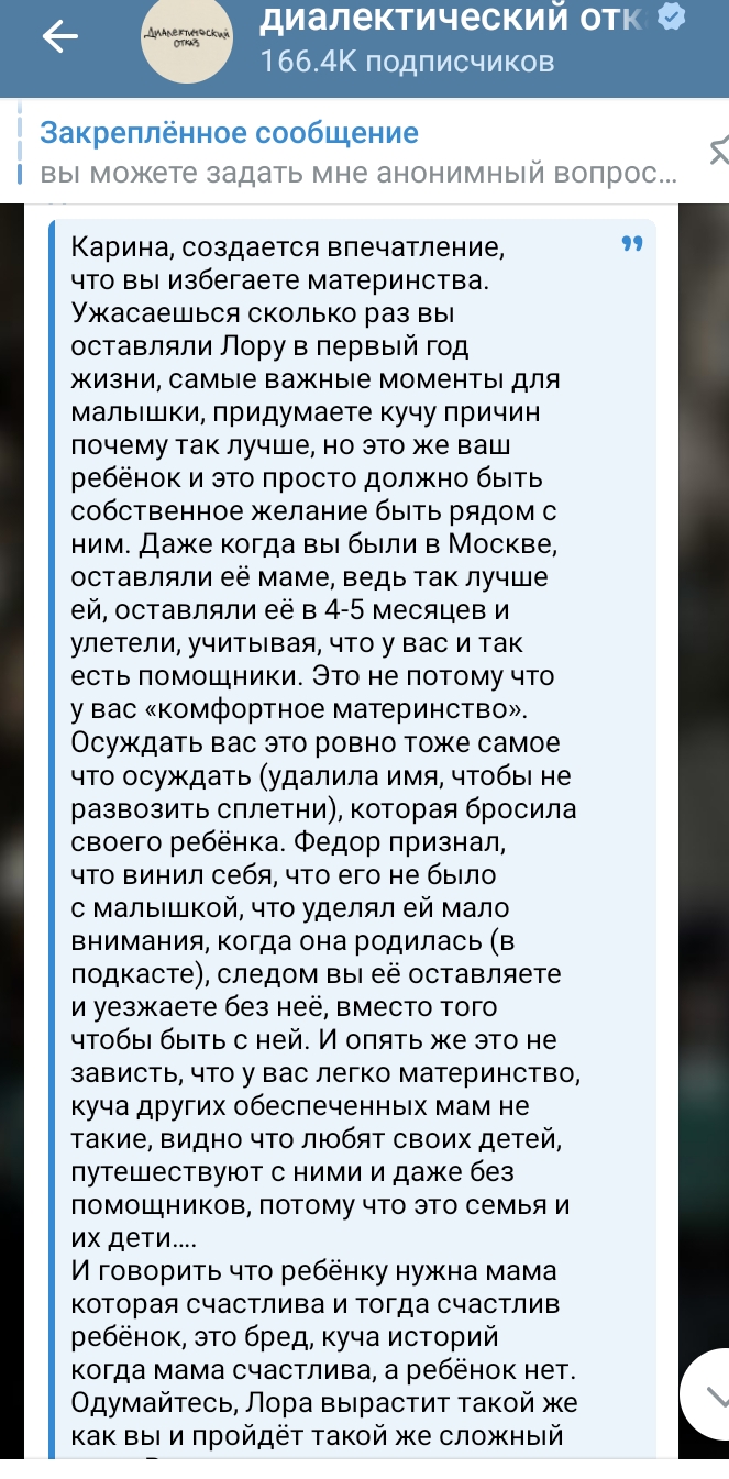 Дристоминой давно не было. С последним мнением согласна. Все традвайфство ей очень сложно даётся. Видно как ей скучно жить и она постоянно пытается куда-то сбежать. Вряд ли она бросит жирный мешок с деньгами первая, но в долгом браке их не вижу со Смоловым. Уж очень вымученно выглядят все эти посты про материнство. Такое чувство что первое время ей это даже нравилось, новый опыт, гормоны. А сейчас все осточертело