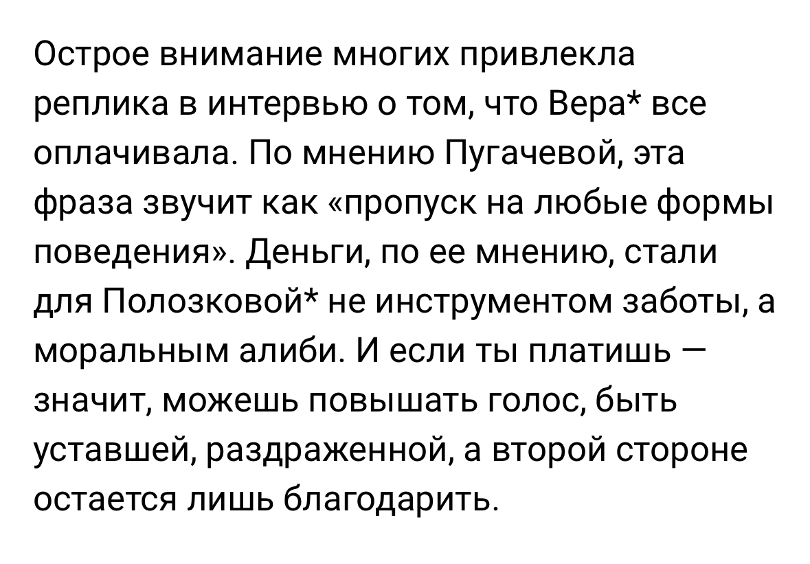 В целом Полозкова эпичная тупая пизда, которая совсем уехала кукухой. Тупо три часа выдавала тейки уровня типичного пидорашкинского мужика: да я тут в семье всех содержу, жена нихуя не делает с тремя детьми, корчит недовольную морду когда я возвращаюсь, сука-мразь. В итоге у большинства зрителей бомбануло, как раз потому что там основная аудитория - женщины с такими вот бывшими мужьями.