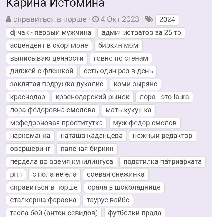 > но она не такая уж тупая как будто, весёлая, дружелюбная, даже скуф пузан киданул её недавно, почему так? Я бы сказала она прямо очень такая хозяйственная баба, обычно мужики таких любят. Если бы она себе не выстраивала образ нереально сексуальной бабы, нашла бы такого же домовитого скуфа, и все бы у нее было заебись.