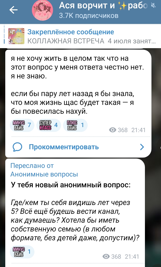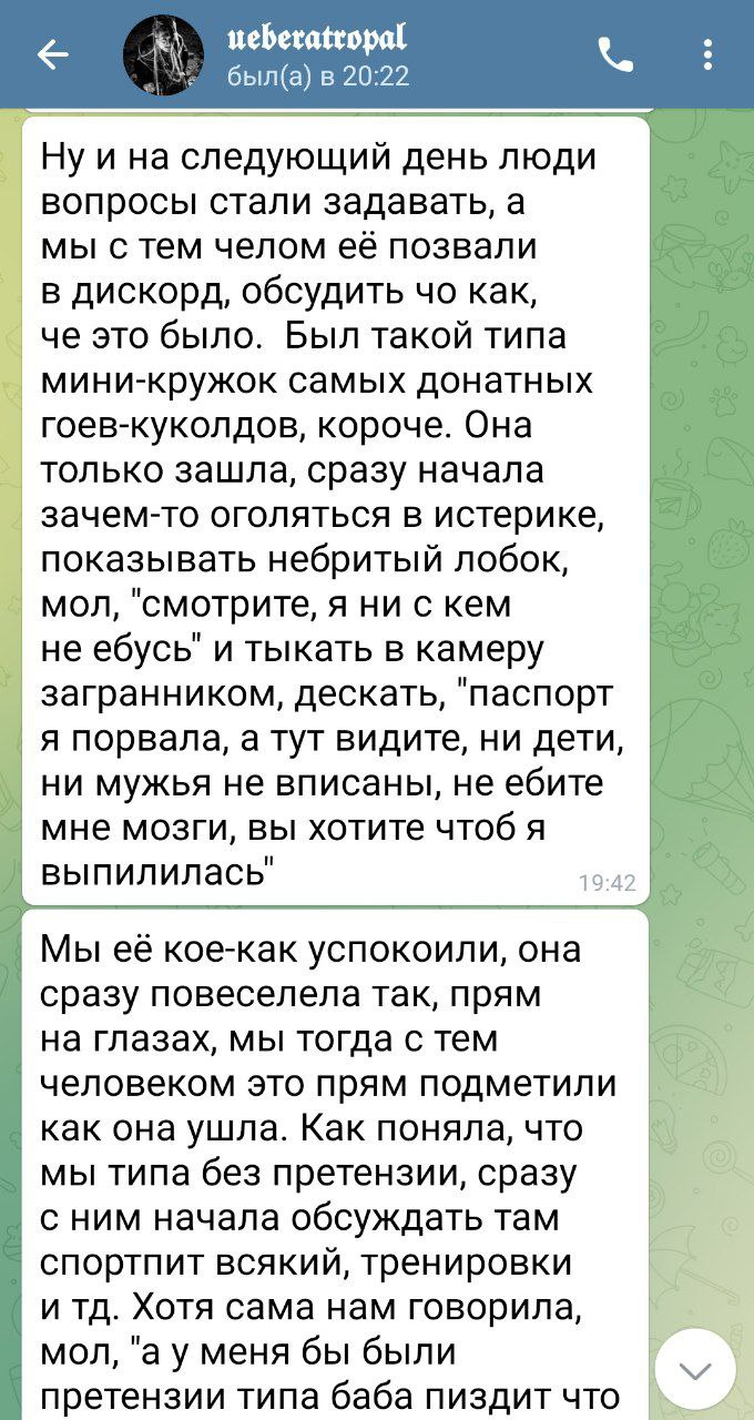 >>6181174 >>6181167 О, наконец можно бесячую Судьину обсудить. Не, они давно общаются. Смотрела киберфланеры с Судьиной. Она там в качестве подарка зрителям хотела впихнуть ношеную толстовку Коваля с кровякой. Судьина это такая пиявка в компаниях, которой очень нравится демонстрировать как близко она корешится с крутыми по ее мнению людьми. Любимые фразы: "я отжала вещьнейм у комикнейм лоооол", "я припёрлась в гости и осталась жить лооол", "хотела стрельнуть сигарету, отжала всю пачку лооол типичная я" Такие есть в любой компании, обычно они имитируют интерес к сфере, но на самом деле хотят быть в одной тусовке с кем-то Так вот, на кибефланерах она сказала, что отдает в качестве подарка толстовку Коваля и упоминала, что сдавала в ней кровь и там маленькое пятнышко крови осталось, но это не страшно. Зрительница, которой это предназначалось, чуть не блеванула, написала в чат мол фууу, не надо мне это, можно поменять.