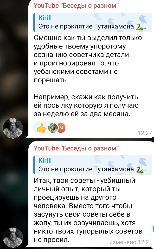 >>6183374 Ожил и уже плюется ядом на хомяков. В голосовых Букаха ныла, как на ней наложено проклятие, как по жизни ей не везёт. То телефон сломается, то ПетрБарисча надо за деньги лечить, то платье не идёт, то игрушки раскупили, то заначку приходится опустошать. На что в комментах ей написали, мол, ну как бы половина этих вопросов решается наличием второго телефона, страховки, ну и фриланса чтобы покрывать расходы. На что ошмётки жопы Букахи и Скуфдавра разлетелись по всеми Нови-Саду. Работать?!! Перестраховываться??!! Советы у тебя уебищные, сдохни тварь!!!