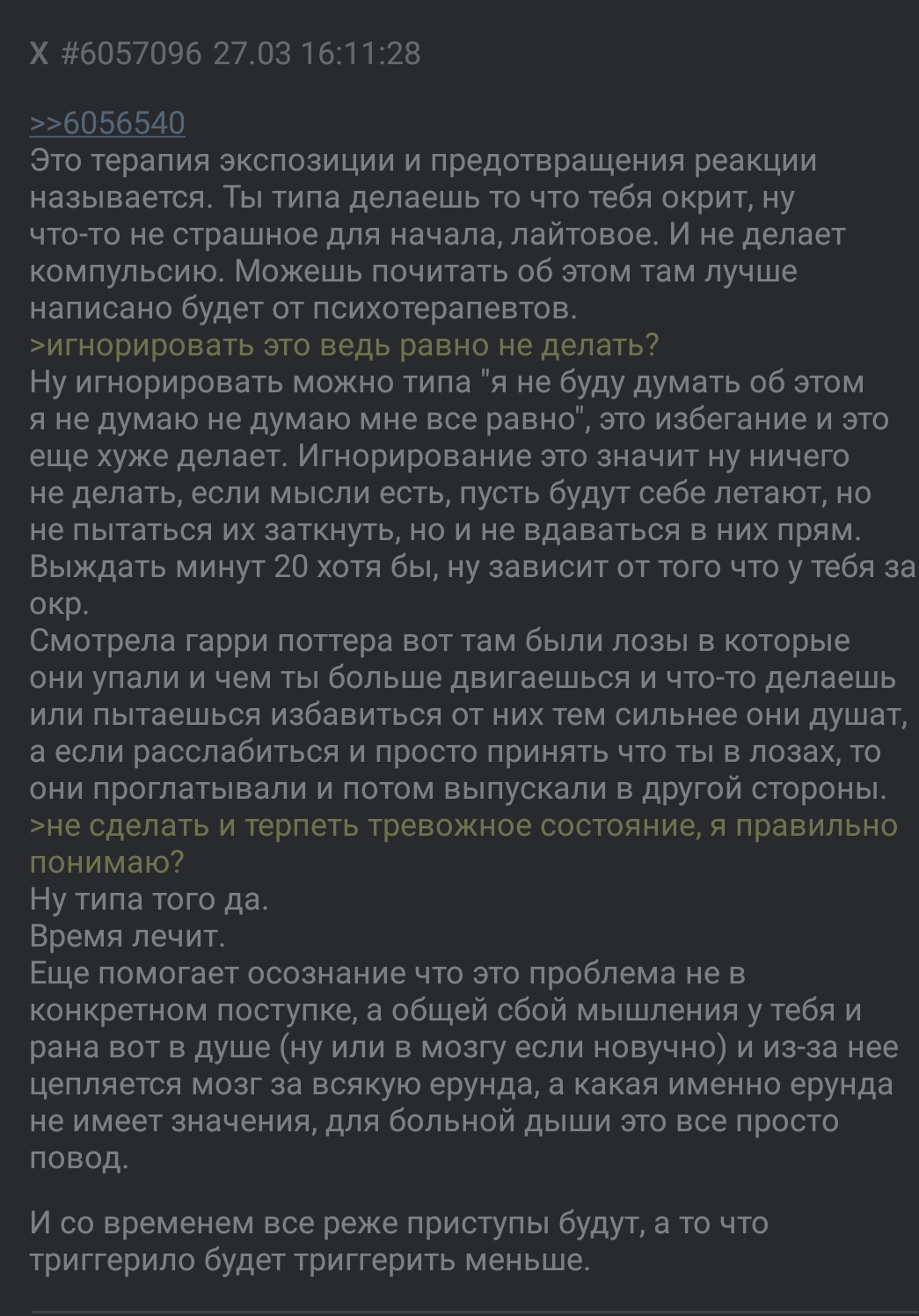 >>6056540 эх я отправляла большой пост но меня забанили за мелочь и удалили посты и щас только бан прошел и мне лень пост писать снова, короче почитай про терапию экспозиции и предотвращения реакции и помнишь как в гарри потере они упали в лозы и надо было расслабиться и принять все чтобы он проглотили (что неприятно) но потом отпустил, а если делаешь что-то то душат