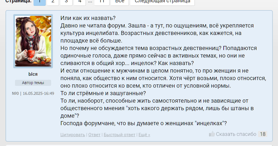 В этом ебаном мире нет ничего важнее интимной эмоциональной и физической близости, мнение всяких независимых самодостаточных шизесс саморазвиваторш про важность карьеры, хобби и социальной жизни, и про то, как они наедине с собой познают дзен и находят умиротворение в простых удовольствиях, читая книжечку о духовном росте в парке под сенью деревьев, пока их ласкает летний ветерок, и как они чувствуют себя в моменте и вообще счастливы и благодарны этой жизни оаоаоаоао и все такое прочее меня вообще не интересует, харкнула бы каждой такой ебанашке в ебало, как вы меня блядь бесите, отьебитесь от меня со своей ебалой, умоляю, я хочу жить обычную жизнь нормисную, с либидо, с партнером, НОРМАЛЬНО хочу жить, это понятно или нет? Все, нихуя больше писать не буду, токсичная помойка здесь такая же, как и везде.