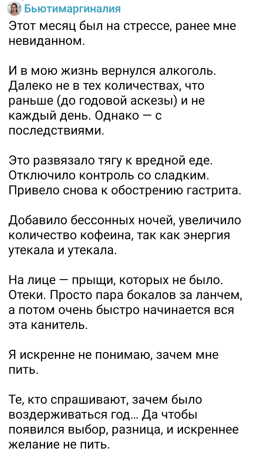 >>6185420 У меня дисфункциональная хуевая семья из мухосранска, у них куча дурацких установок, зависимостей, все с лишним весом и т.д. Я всегда была белой вороной, типа нитакуся, часто это проявлялось кринжово, но как уж есть. Сейчас мне 30, я уже ~ лет 6 как их не видела. Сначала съебалась в город побольше, а затем в другую страну. Отношения охладели и ещё больше испортились. Сказала, что беру паузу в общении. Пауза затянулась больше чем на полгода, возобновлять не планирую, жизнь стала ещё лучше по всем фронтам. Заметила, что личные границы стали крепче, появился здоровый похуизм на неважные вещи и, напротив, ресурсы на важные вещи (избавление от вредных привычек, спорт, учеба, фин.грамотность и прочее), замолк внутренний критик, который постоянно ебал мне мозг голосами моих родственников (звучит шизово, но такое реально есть у выходцев из нездоровых семей). Сейчас благодарна себе-подростку за проявления бунтарства. Они были кринжовыми, но это были первые шаги к сепарации, и теперь я намного здоровее, чем могла быть. А вот сестра осталась там и служит прекрасным примером а-ля «жизнь, которой я боюсь» (она не виновата, там сложные хитросплетения отношений с мамкой-нарциссихой, она выбирает себе любимчика и козла отпущения, у козла есть шансы вырваться, у любимчика практически нет).