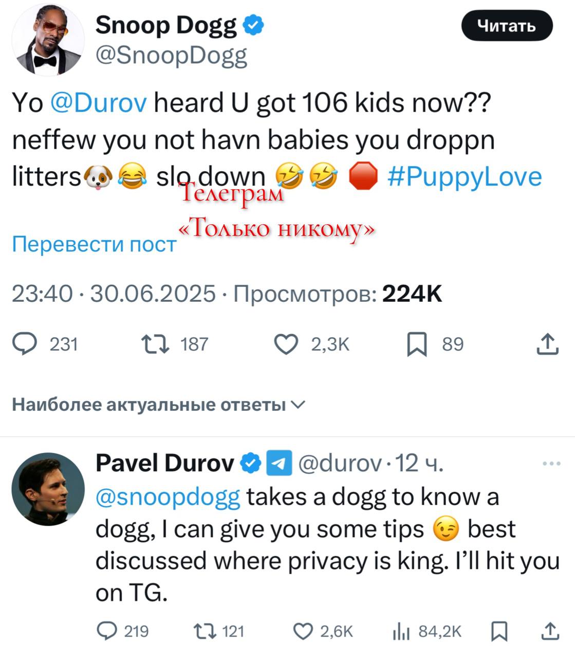 Снуп Догг нехило зацепил Дурова.. «Пацан, у тебя нет детей, ты плодишь выводки щенков, сбавь обороты», - написал он про 106 детей. Павел попытался сыграть на его поле - «нужно быть собакой, чтобы понять собаку» и типа перевел разговор в личку в тг.