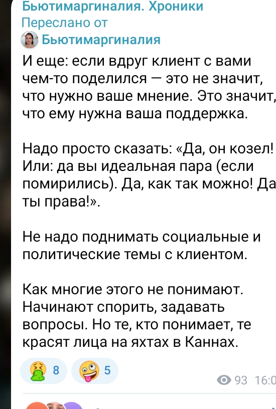 >>6186127 > другое дело, когда ты просто человек и хочешь жить свою жизнь, а не только спасать подружку/мамку/кого бы то ни было ещё. База. Нормальная адекватная дружба должна состоять из приятного взаимного общения и времяпровождения. Это дорога с двусторонним движением - комфортно мне и комфортно со мной. Когда ты годами срываешься и бежишь спасать плачущую подружку, чтоб она потом опять вернулась к своему мудаку, это тупо выкачка твоих сил. Наполнения и отдыха от такой дружбы не будет.