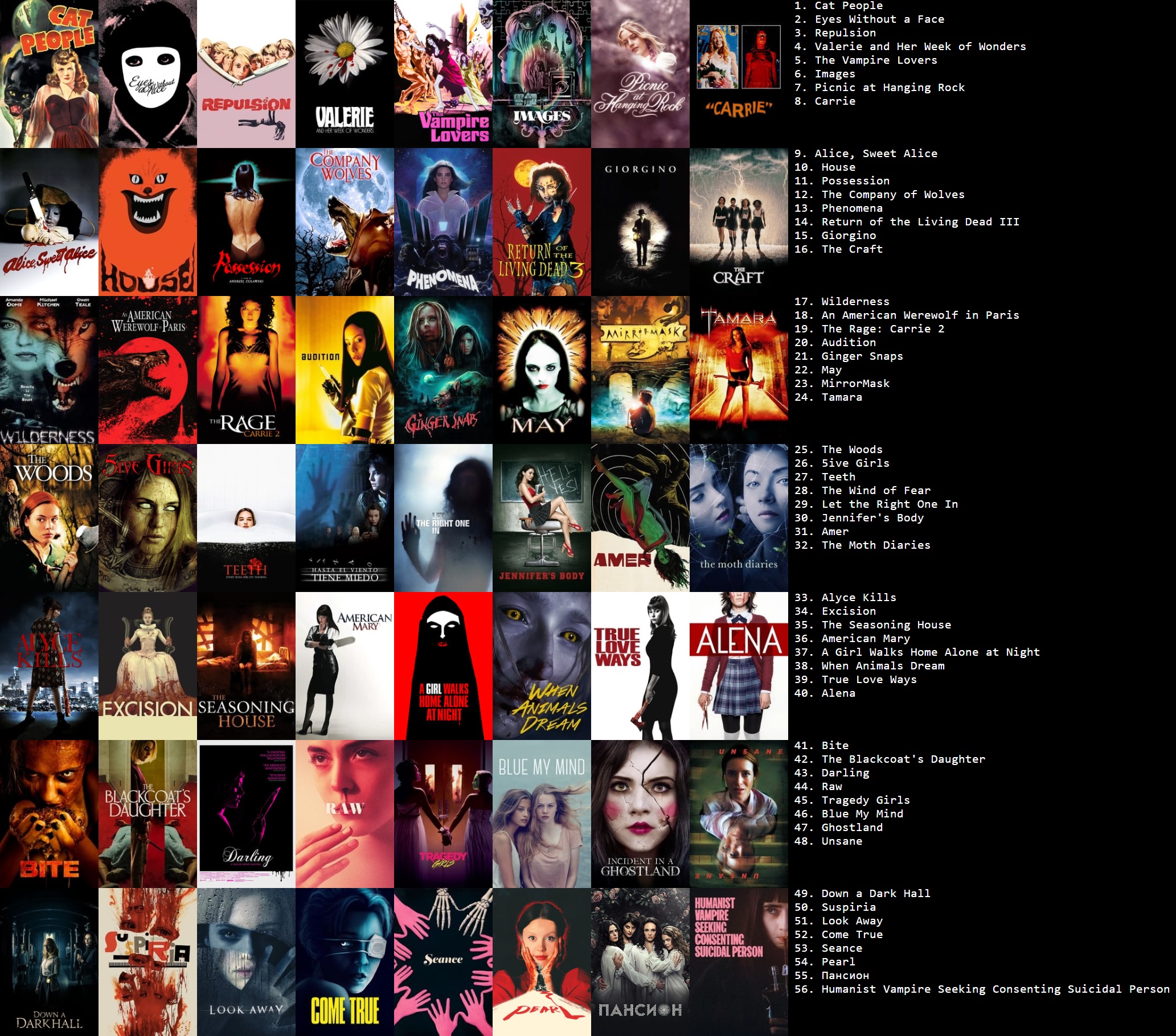 Первый ряд: Ginger Snaps (2000), Ginger Snaps 2: Unleashed (2004), Ginger Snaps Back: The Beginning (2004), La Residencia/Дом, который кричит (1969), The Woods/Тёмный лес (2006), Come True (2020).