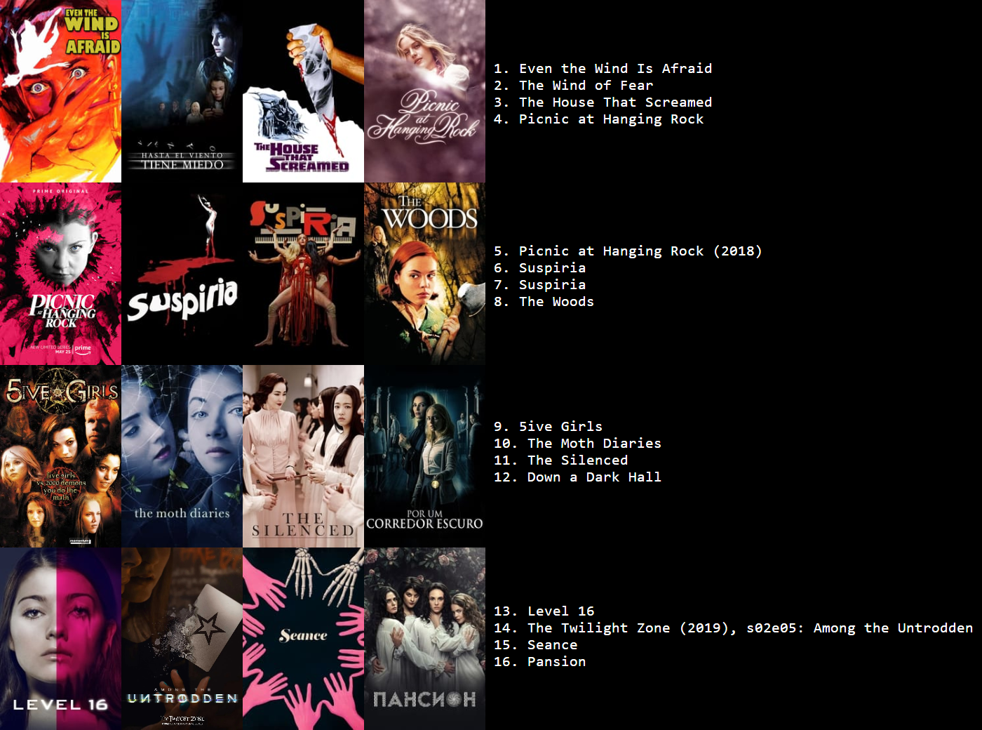 Второй ряд: Blue My Mind (2017), May/Мэй (2002), Veneno para las hadas/Яд для фей (1986), Picnic at Hanging Rock/Пикник у Висячей скалы (2018), The Silenced/Школа Кёнсон: Пропавшие без вести (2015), Level 16 (2018).