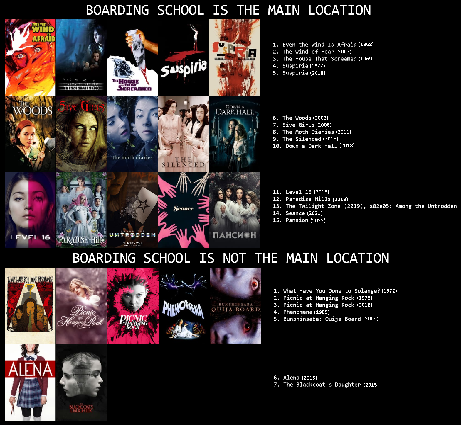 >>5913591 Пожалуйста. Ну, и раз уж такое дело - держи списочек хорроров про женские закрытые школы/пансионы. Стоит прояснить ситуацию с некоторыми тайтлами. "Even the Wind is Afraid" - это мексиканский мистический хоррор 1968-го года, а следующий фильм, озаглавленный "The Wind of Fear" - это его ремейк 2007-го года. Фильмы имеют общую сюжжетную основу, но совершенно разные в плане постановки и атмосферы - оба отражают дух своего времени и по-своему интересны. Ремейк 2007-го года тяжело найти - и ещё тяжелее найти перевод на английский (перевода на русский не существует). Два "Пикника у Висячей скалы" - это опять же оригинальная экранизация 1975-го и альтернативная экранизация 2018-го года, выполненная в виде мини-сериала. Обе экранизации опять же имеют общую сюжетную основу, но кардинально различаются в плане постановки и атмосферы - обе по-своему хороши. С двумя "Суспириями" ситуация идентична - первая оригинал, а вторая ремейк (хотя уместнее называть переосмыслением), имеющие общую сюжетную основу, но кардинально разные во всём остальном. "Among the Untrodden" - 40-минутный эпизод "Сумеречной зоны" (сериал-антология, в котором серии не связаны общим сюжетом), настолько хороший, что был добавлен в качестве полноценного тайтла. "Пансион" - российский мини-сериал 2022-го года, единственный представитель данного жанра, снятый в России - и при этом на удивление достойный. Остальные тайтлы в пояснении не нуждаются. Приятного просмотра.
