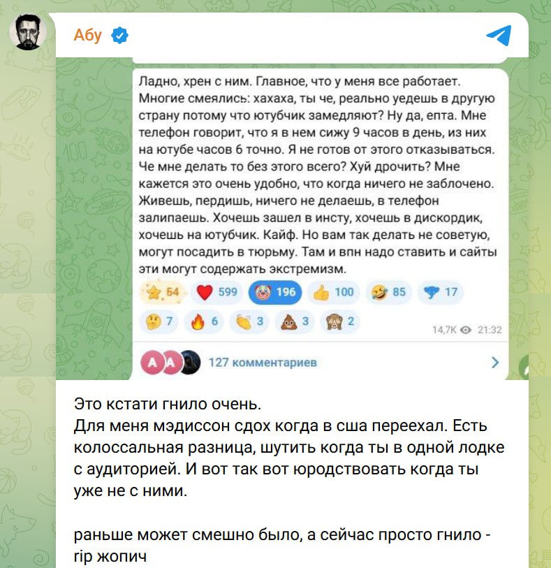 Это какой-то пиздец. Админу тг канала Больше 17ти лет на ютубе 19 лет. Я думала ему хотя бы 25