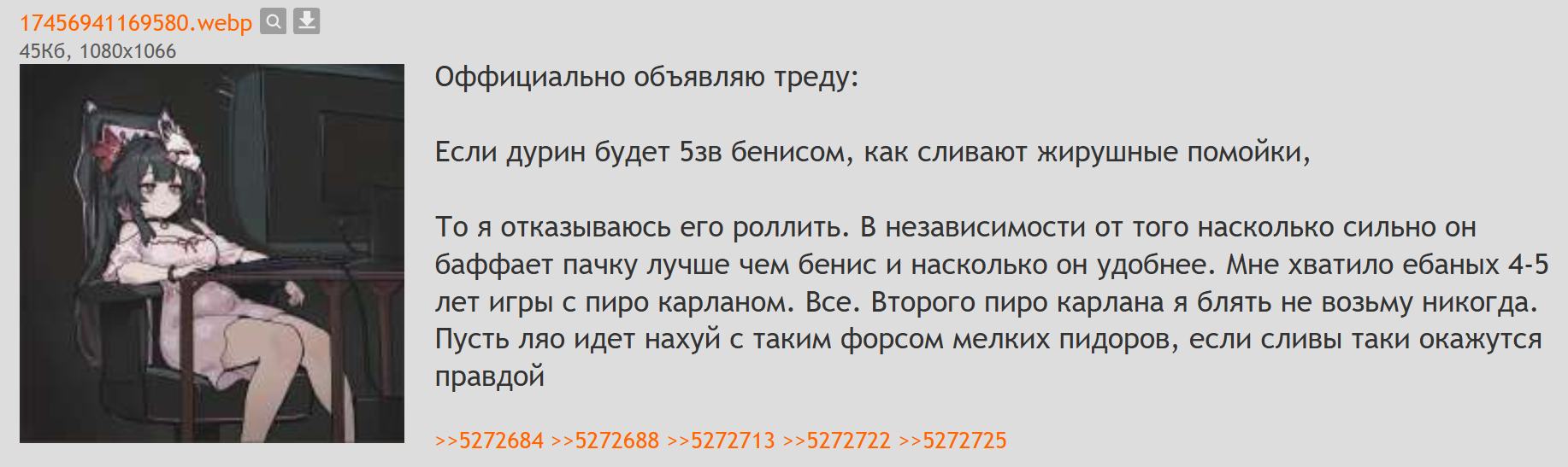 Нетоксичное говно выше выдавило всех постерш из не-бариновских гач, окончательно добив мертвый тред, и теперь бегает ищет виноватых вокруг, держу в курсе
