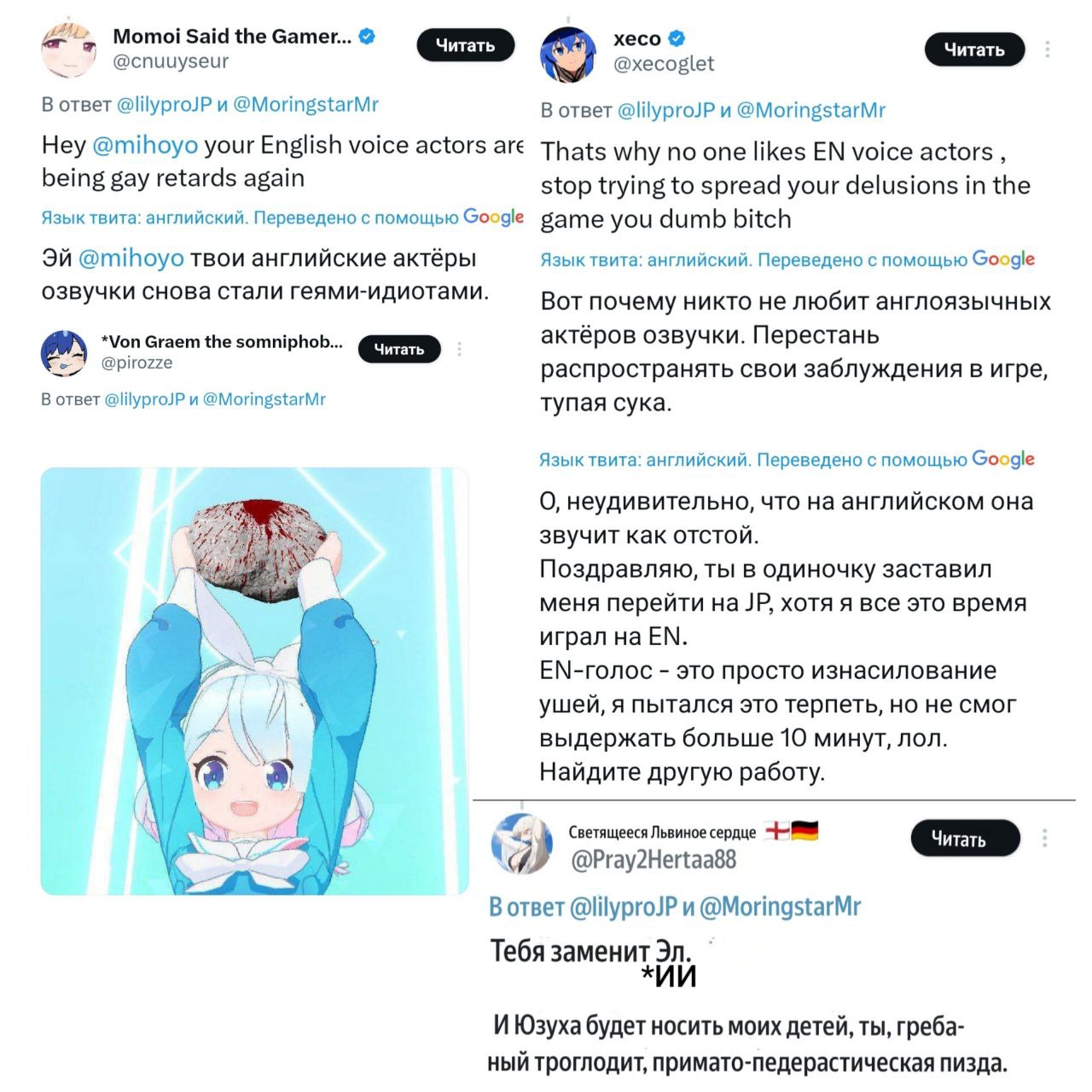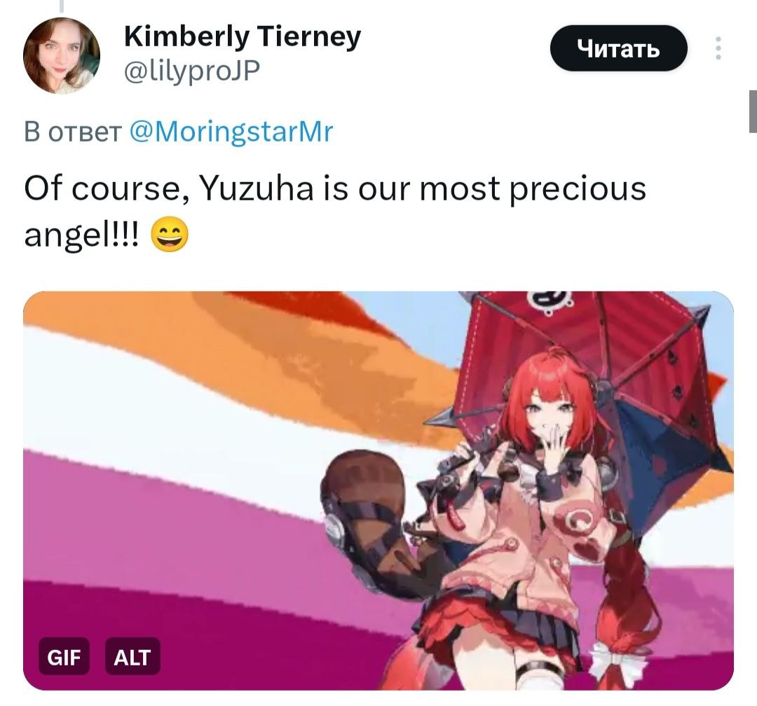 Порнодебилы ущемились из-за того что их вайфучку назвали лесбиянкой и побежали травить актрису озвучки. Самое смешное, что уже появились комментарии мол она это заслужила и вообще это непрофессионально пихать политику в работу, видимо гифка в твиттере актрисы как-то проникла в файлы игры и запихнула повесточку в реплики юзухи, потому что как иначе это влияет на персонажа я хз. "У зетки самый комфортный фд!!" кстати, не забываем