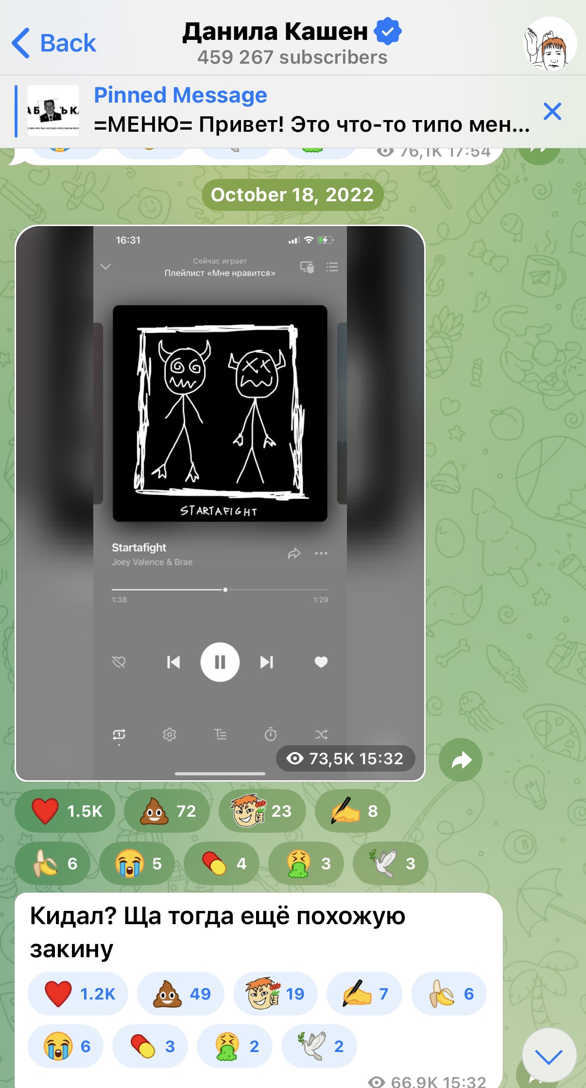 помню сиса рассказывала что поех подворовывает песенки, так вот, случайно наткнулась на «startafight» и что-то уж больно напоминает «не сей любовь», провела иследование и увидела что наши золотые поехины ручки выкладывали к себе в тгк эту песню еще в октябре 22, тут либо вдохновилась продюсерская душа, либо решила особо не заморачиваться с мелодией которая изначально задумывалась для дверы как я помню