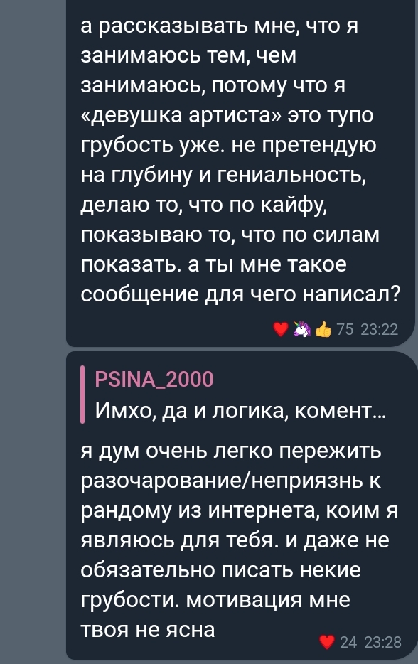 Картошен одно время вообще как влюбленный в нее себя вел, то комплименты, то жестко гасил. а как узнал, что у нее с Никитой, с которым они знакомы, отношения так вообще на нее начал гадости лить (не привязывая к тому, что она нашла парня, конечно, под другими предлогами). явно он в глубине души верил в этот шип. возможно если бы она ему проявила знаков внимания побольше и была чуть менее яркой личностью в медийке (такой как Шлюма), то Творец бы с ней очень даже отношался. а так слишком уж она деятельная и медийная. на таких он только в фанатзиях дрочит, а в жизни боится и прикрывает агрессивными рофлами, почти как и Мазелов