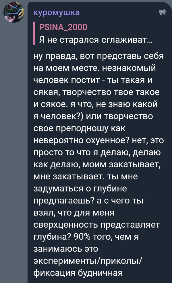 >>6218806 Двачую. Ну столько претенциозности в Куроме, я прям не могу. При чем мне кажется, что это именно из-за Славика она возомнила себя бог знает кем, ну типа если меня трахает "гений", то я и сама нихуя себе какая. Вон когда Всячу очочки и водичку подавала в 2016 мышь мышью была, и на стримах Лешиных тише воды ниже травы сидела хотя в в кадр-то все равно лезла лол.
