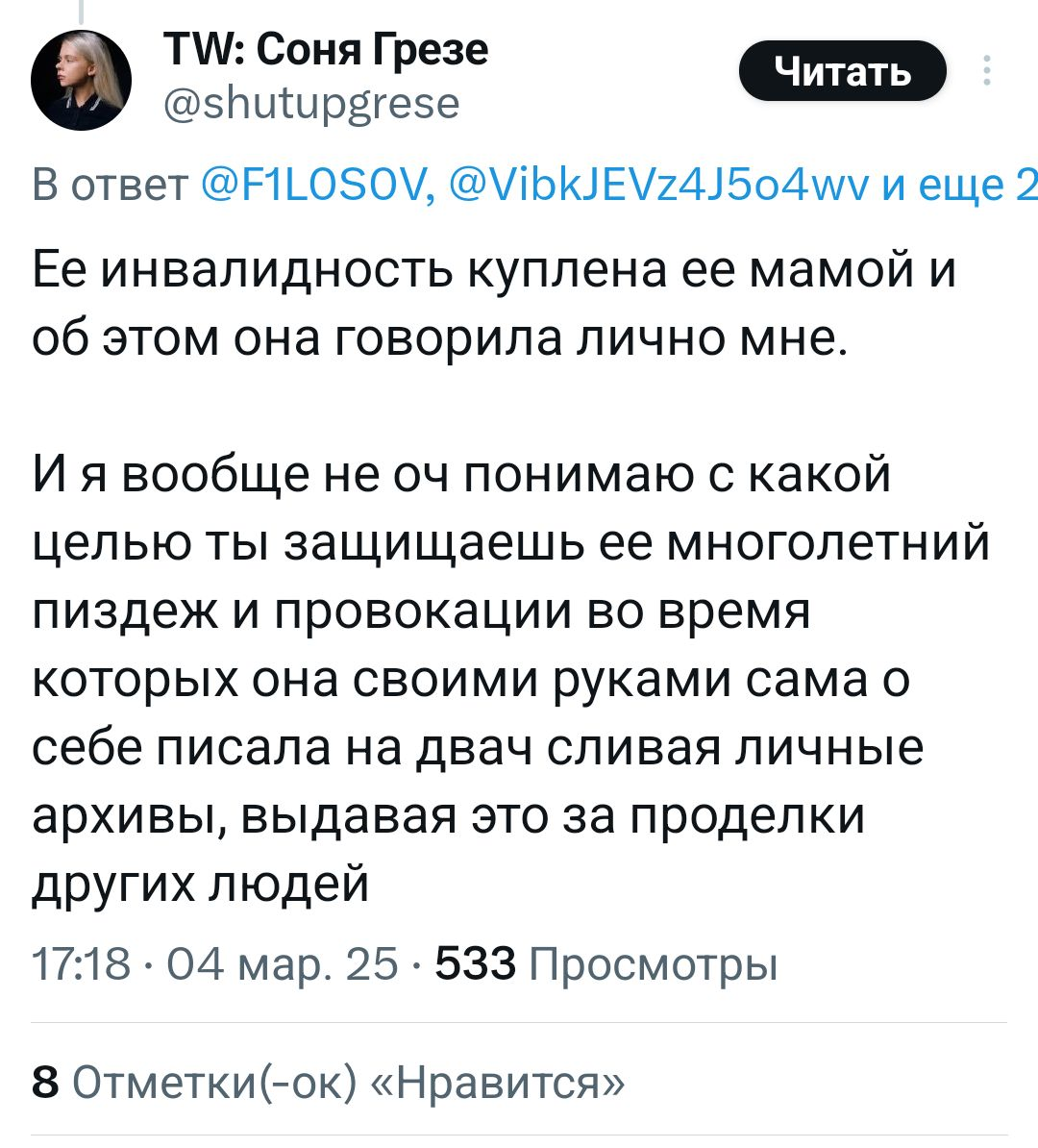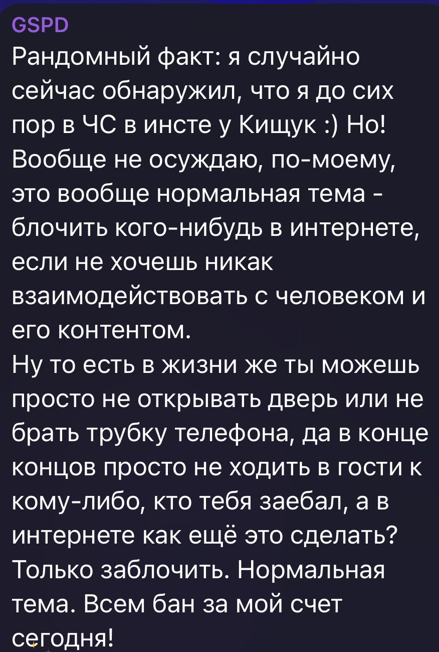 Наткнулась случайно на старый скрин с багини про Хряка. В общем и целом по многим тейкам это действительно на него похоже, особенно про "мне не нужны отношения" (он буквально так даже в треках поет), про скользкие темы и шутки, про девочек из обеспеченных семей (вспомните рпт-тян) Еще и забавно, что этот пост датируется летом 2021, когда Хряк с Орзушкой начали мутить))