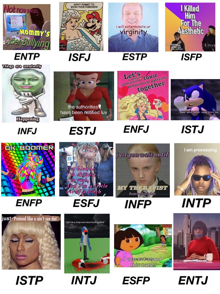 >>6205862 >Ля секс Каждый раз удивляюсь такой реакции, кек. А ты какой тип? >Какие типы нравятся? Я как раз на мбти-шном плохо понимаю, но если напрямую переносить с соционики, то ISFJ и ESTP - последние больше по угару и в дозированных количествах.