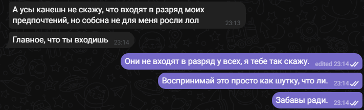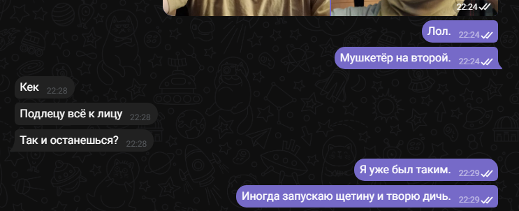 >>6222205 >там и написаночто, что её это не устраивает. Ты не понял. Скрин был не к тому, чтобы показать, что ей нравятся мои выходки с усами, а в том, что и с ними я буду любим. А ещё больше в том, что мне всё равно на общественное порицание в области внешнего вида или чего-то там ещё. Если я чувствую, что я внутри прав (а я прав), то с этой точки ты меня никогда не сдвинешь, хоть весь двор на суд внешнего вида позови. Я просто делаю с собой то, что хочу. Хочу очень длинные волосы? Будут. Потом сразу бриться в ноль? Уже было и не раз. Хочу усы девственника или педофила? Сейчас поржём! Начитаетесь своей соционики и потом думаете, что это моё слабое место и что тыкать пальцем нужно определённо сюда.