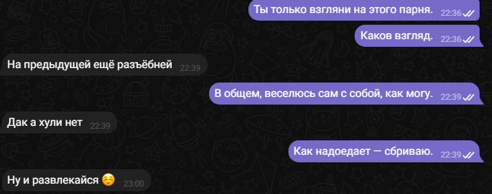 >Ты какой-то злой сегодня Я всего-то заговорил на общепринятом, что используется на постоянной основе в мою сторону, но в обратную стрелочка не поворачивается и я, внезапно, становлюсь злым? Как-то лицемерно, не находишь? Снова говорит о тебе больше, чем обо мне.