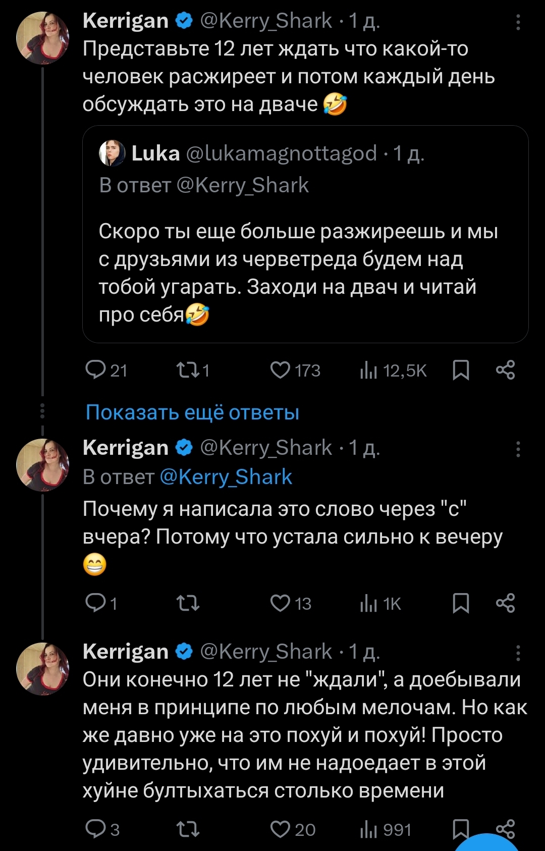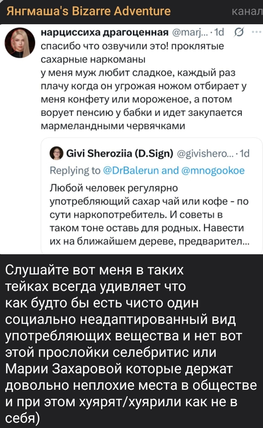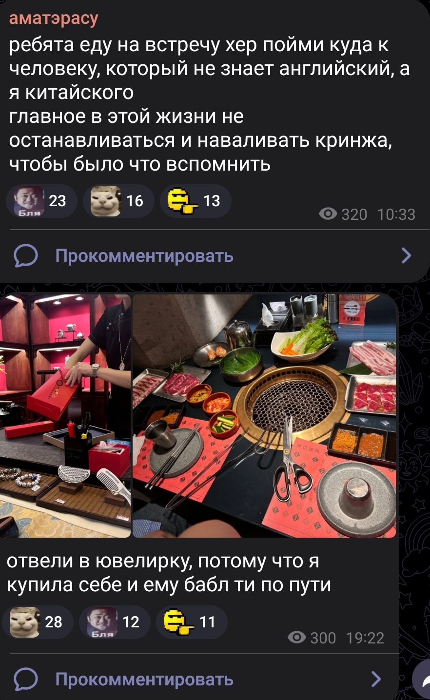 Фактически пока единственный результат всего этого — Землеройка перестала что-то постить про отношения. Интересно, когда начнет снова. Мне кажется, ей и подарки были нужны в большей степени, чтобы в соцсетки их постить, а тут не запостишь. Кстати, сиса одна итт писала, что Землеройка пополамит. Я полистала ее тт и уверена в этом на 90%.
