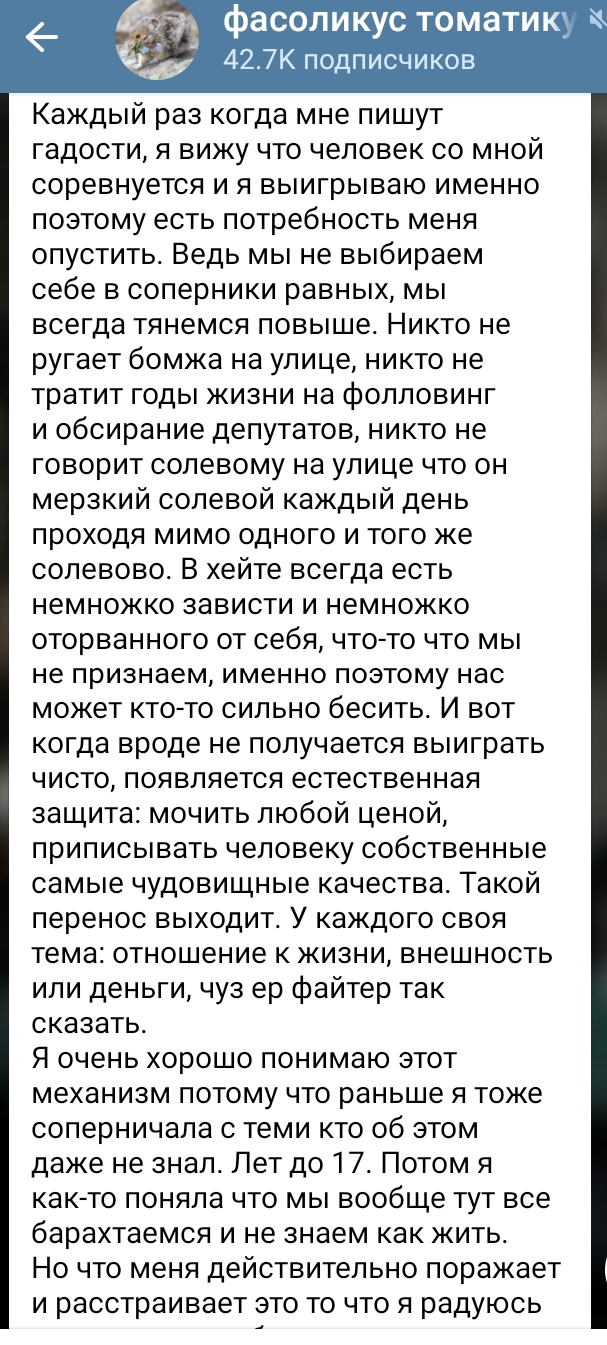 >>6243327 ебанашки, которые получили возможность затравить легкую мишень, при этом еще чето говорили про конфоблядей. ничем не отличаются от них же, такие же говноедки доносчицы. началось все со стенаний про то, как Влад затравил Тати и сломал ей жизнь и карьеру стримерши, в итоге делают то же самое. но это богоугодная травля, оправданная